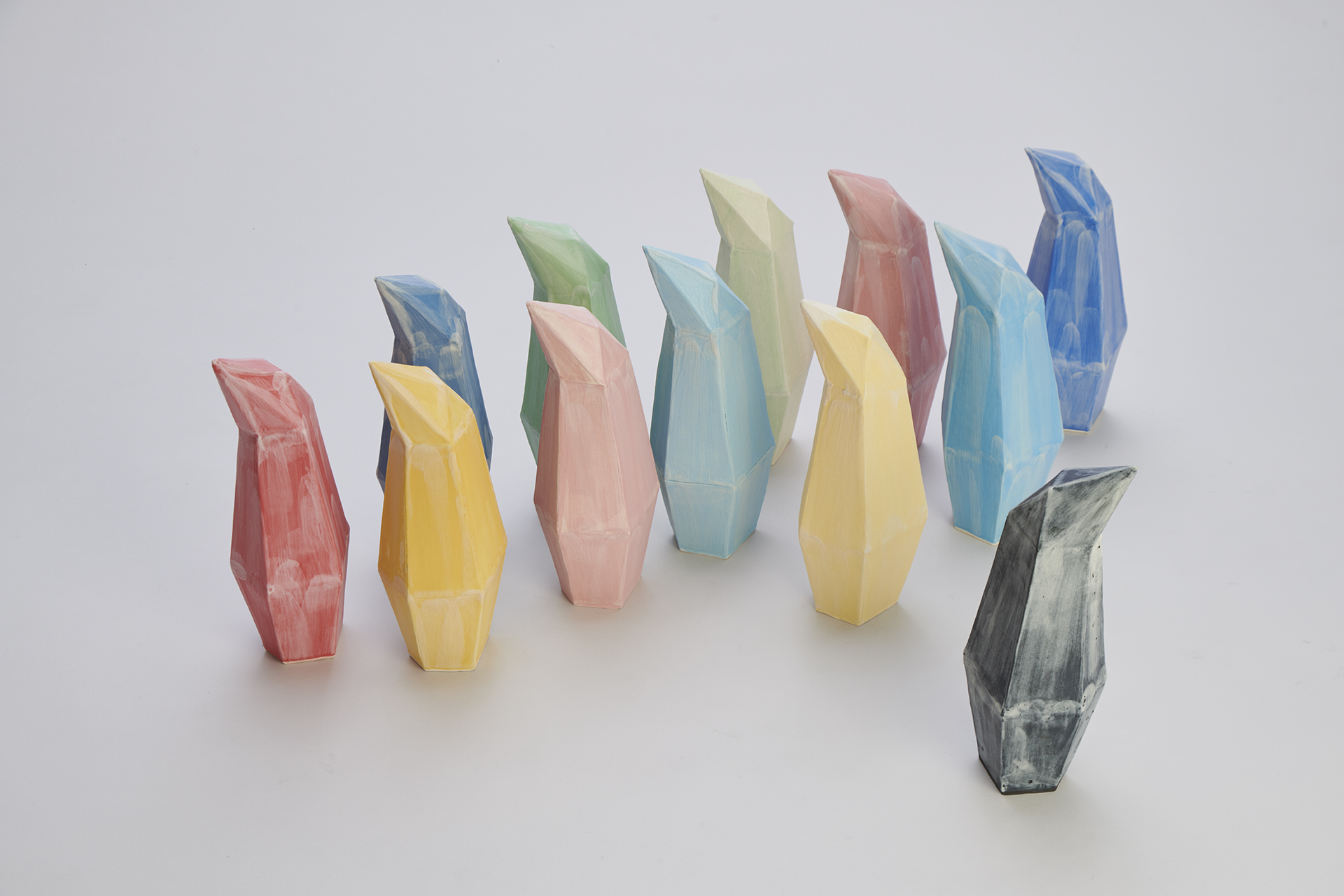 10×11×59cm、8点 古陶土(細)、ろくろ、石灰透明釉・織部釉・伊羅保釉・乳白釉、酸化焼成