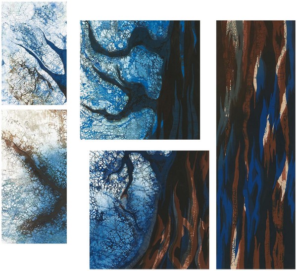 日本の伝統である折紙の技法を用い正三角錐を作り、それらのパーツで画面を埋めることにより、画面に陰影の効果を出した。又三角錐という一見固そうな形状の物を布を使用することで柔らかな物に変化させ、意外性を表現した。加えて三面の色を変化させたことで、見る方向による色の変化の動きを加えた。