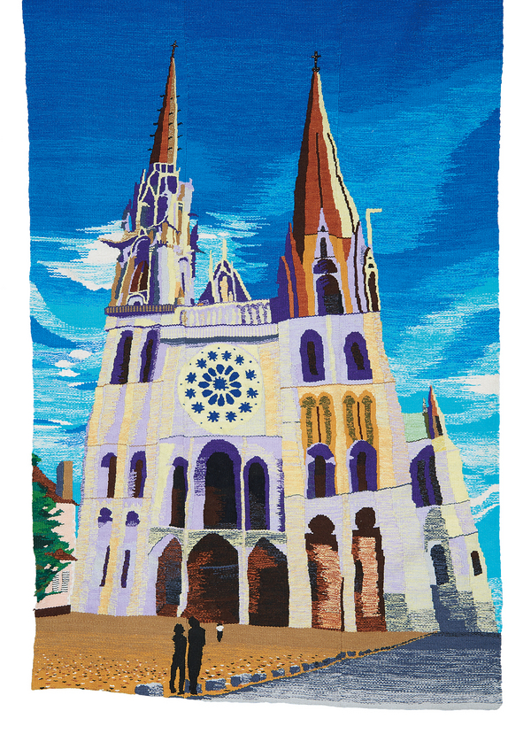 幅広のローラーにくさり編みした糸を巻きつけ版とした。ローラー幅と編み目の形を生かした画面を目指した。