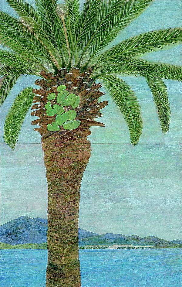 この絵は、岡谷から見た諏訪湖の夕ぐれです。小さい頃から、もう何千回も見て、そのたびごとに自然の美しさ、荘厳さ、雄大さに感動し、そこから勇気、希望、心からの美しさをもらい、毎日毎日生活し続けてきた。このような気持ちを少しでも絵の中に入れられたならば…。