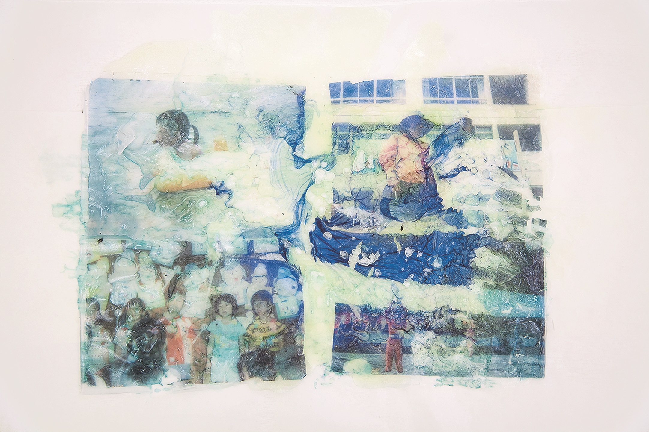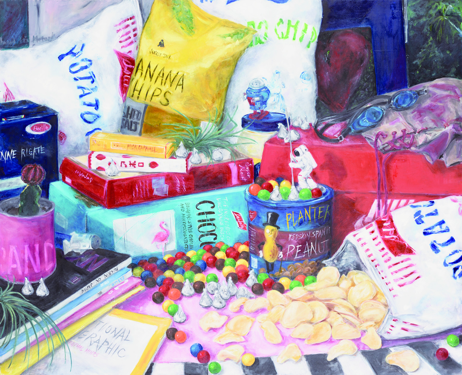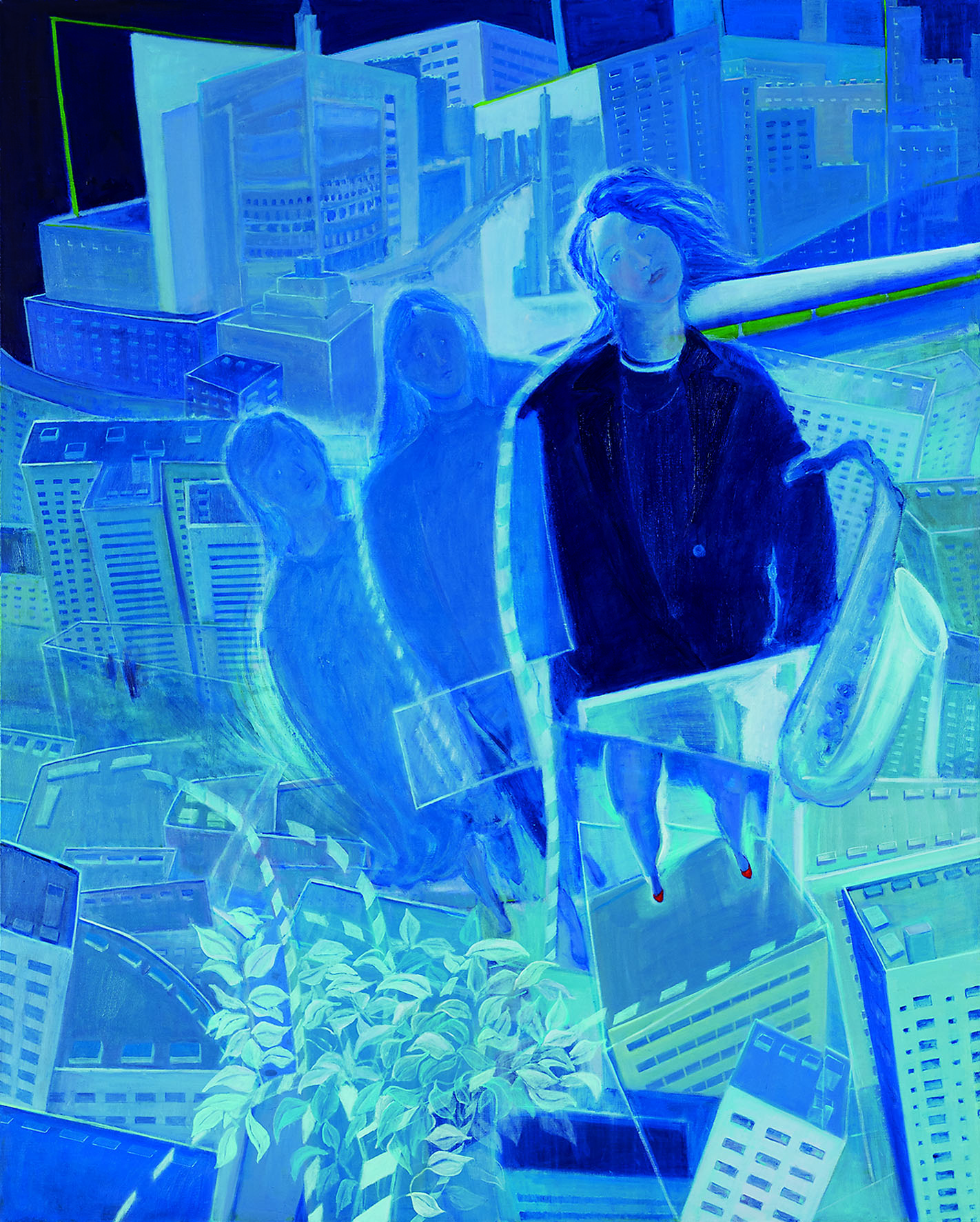 西の空に沈んでいく太陽を見ていると、地球の回る音が聞こえるような気がする。この山も、まわりの風景も、私も一緒に回っている。みんな宇宙の中に在る。その空間で作られた茜色は、見慣れた風景をお伽話の世界に塗り替えた。窓外の春を鮮やかな赤、紫、ピンク、オレンジでふわふわと包み込むようにキャンバスにのせて描いた。