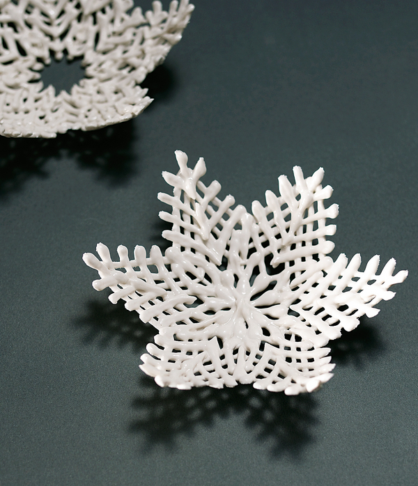 昨年庭に咲いた大輪の白牡丹は、強烈な印象と残像を深く心に描いていた。再び花の精を蘇させる事が出来るならばと、願いを形に表わしてみるべく取組んでみた。白牡丹を、ただひたすら作り続けた。しかし、磁土は気難かしく、頭で描く花との間を近付けてはくれなかった。似て非なる結果となったが、今は、白牡丹に感謝している。