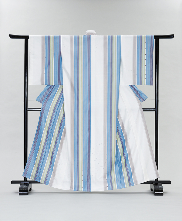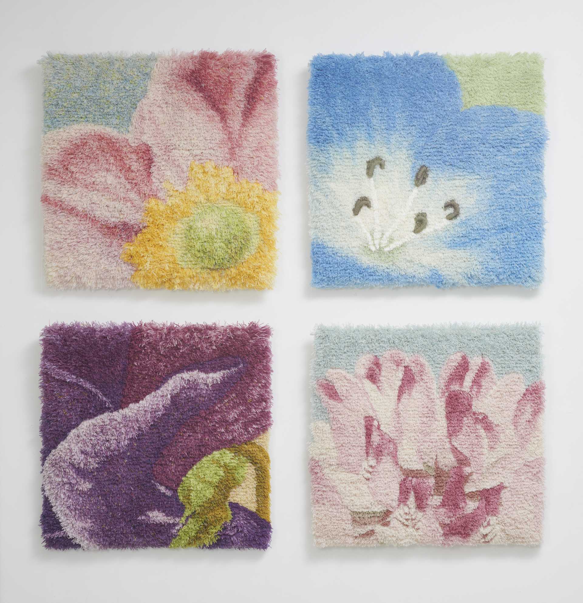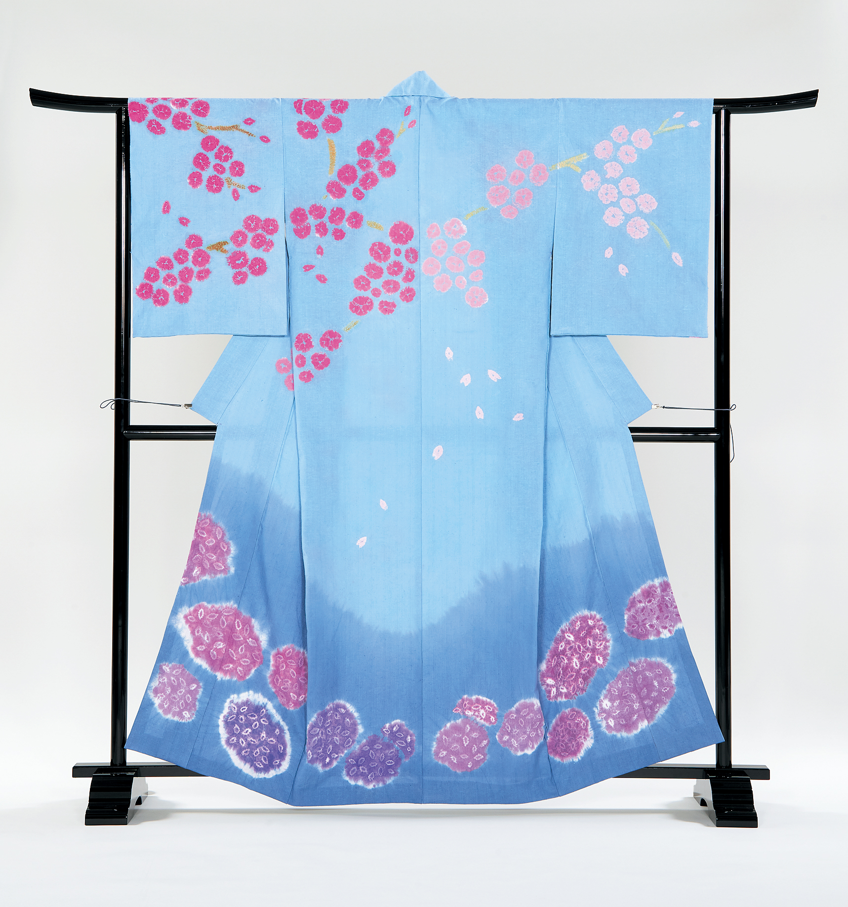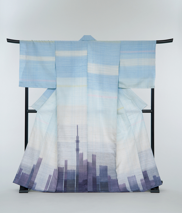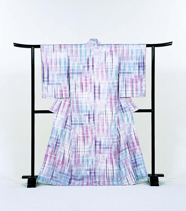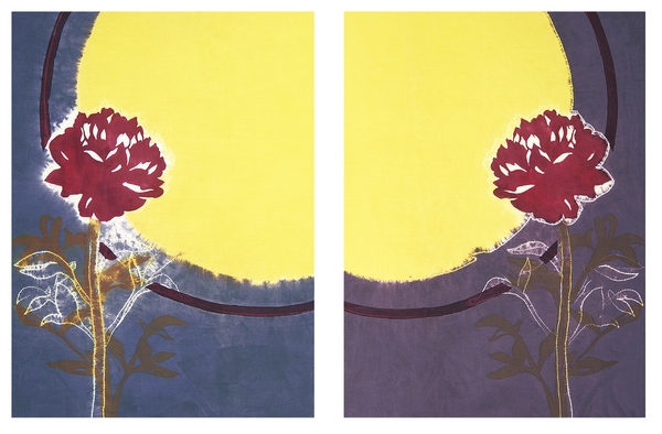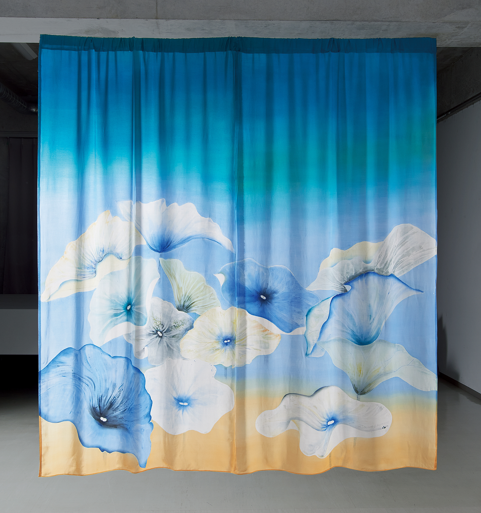 5月のさわやかな風に、豪華絢爛の花びらがゆれる。短い命の巨大輪花ジャーマンアイリスの美しさをいつまでも永遠に残したいと思い布状に表現した。