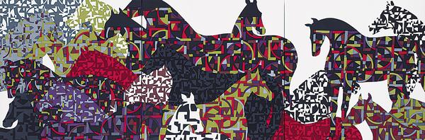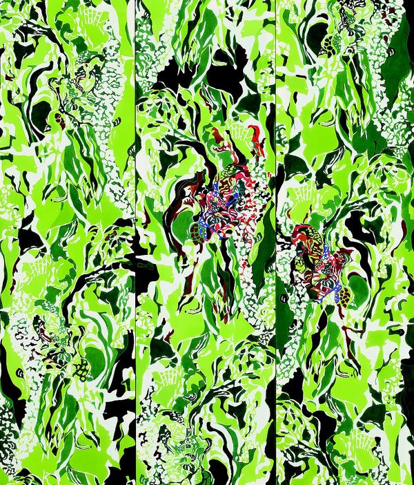 270×43cm、6点 テグス・ステンレス線・分散染料、平織