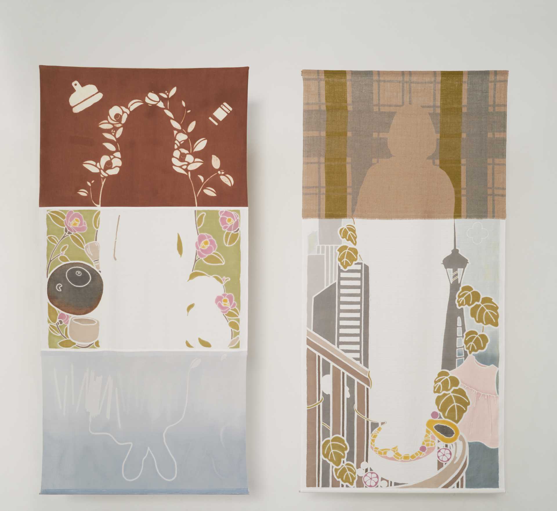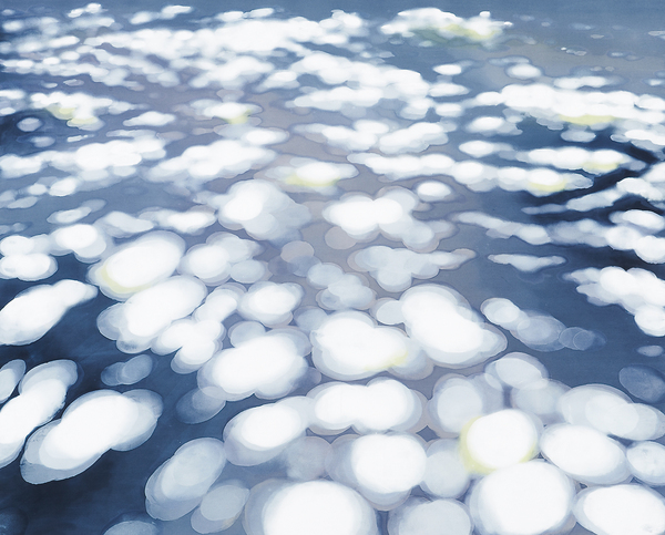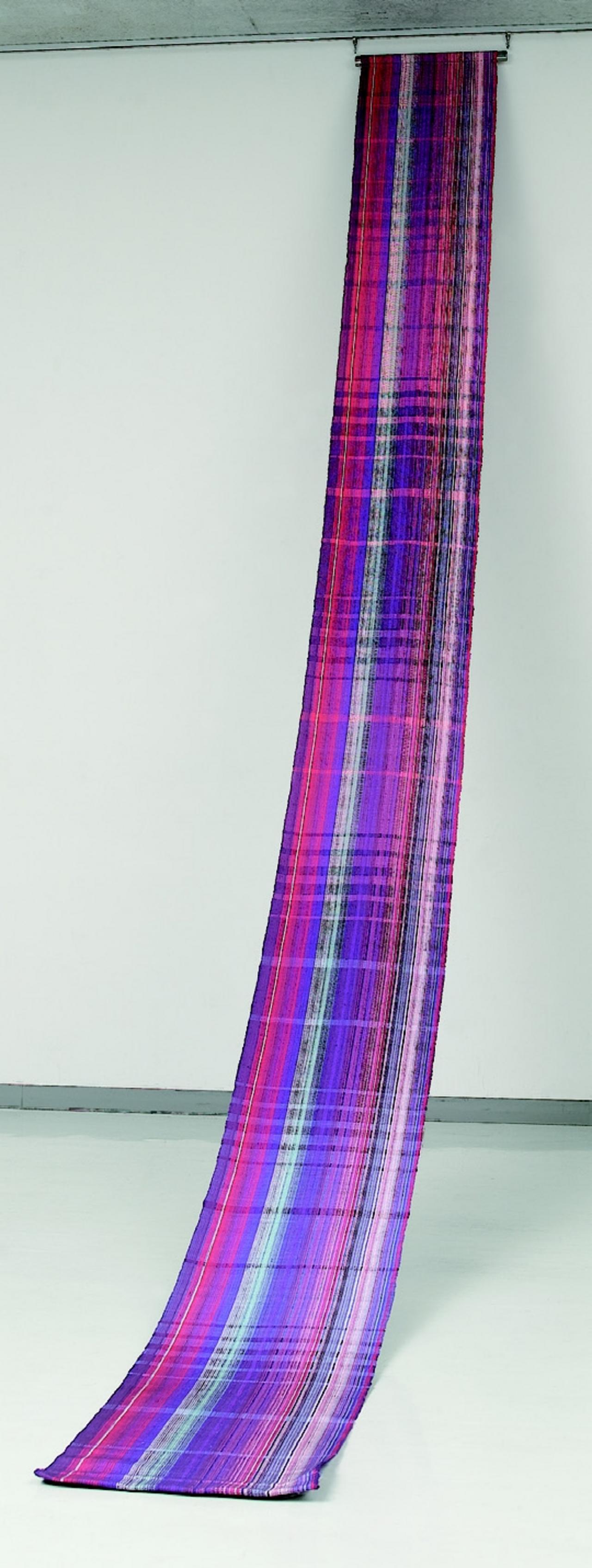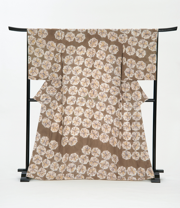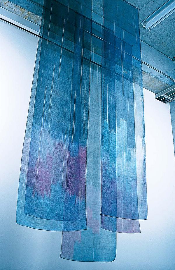 身近にある琵琶湖は季節、天気、空気、光によって刻一刻、様々な表情を見せる。高所から眺めると、琵琶湖にはいろんな方向からの流れが見られ、そこに光とかげが微妙に重なり合っている。そして動きのある湖面が、一瞬時が止まり静けさを感じさせる。絣の技法を使い雄大で静かな琵琶湖を表現しようとした。