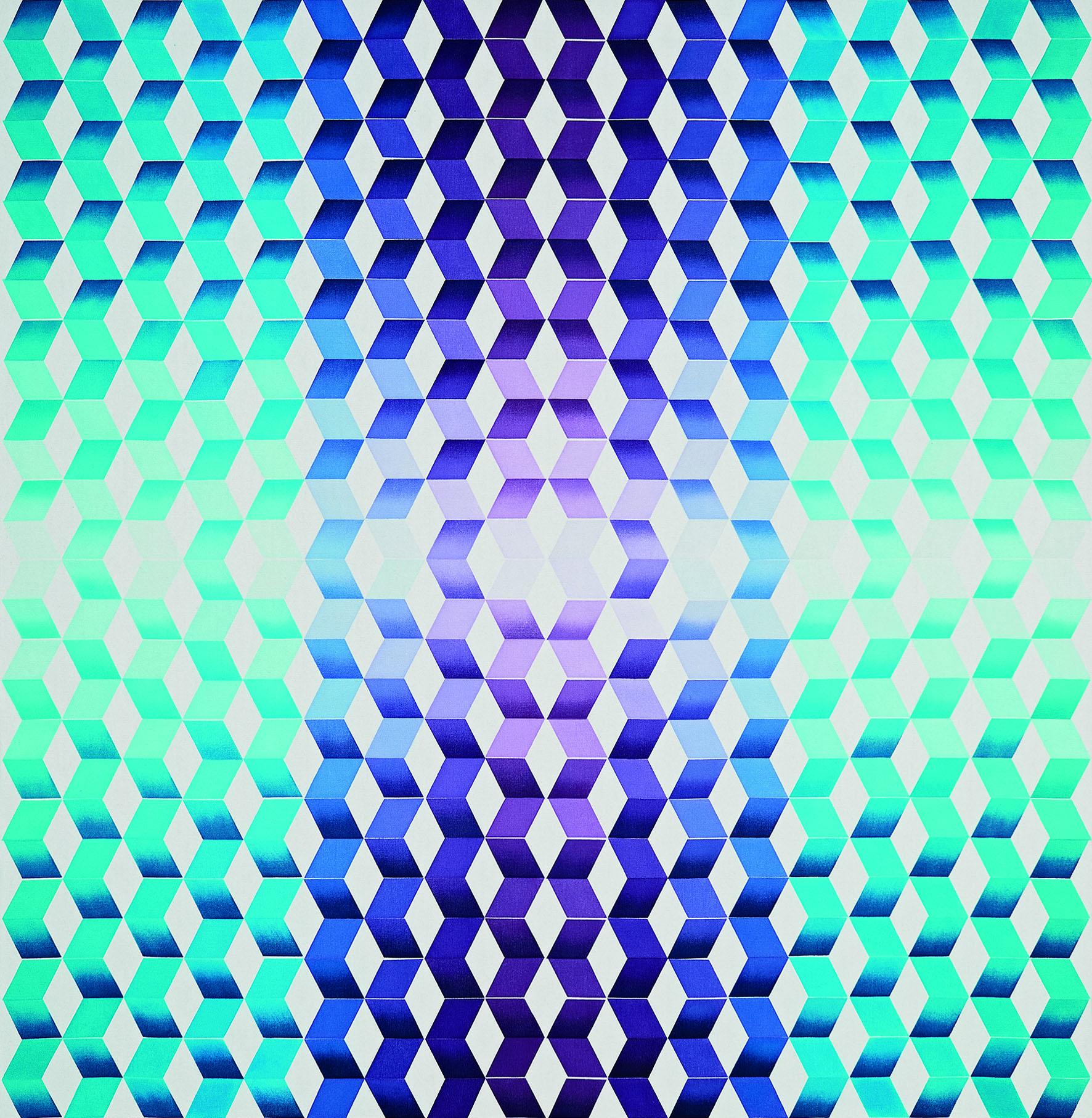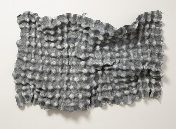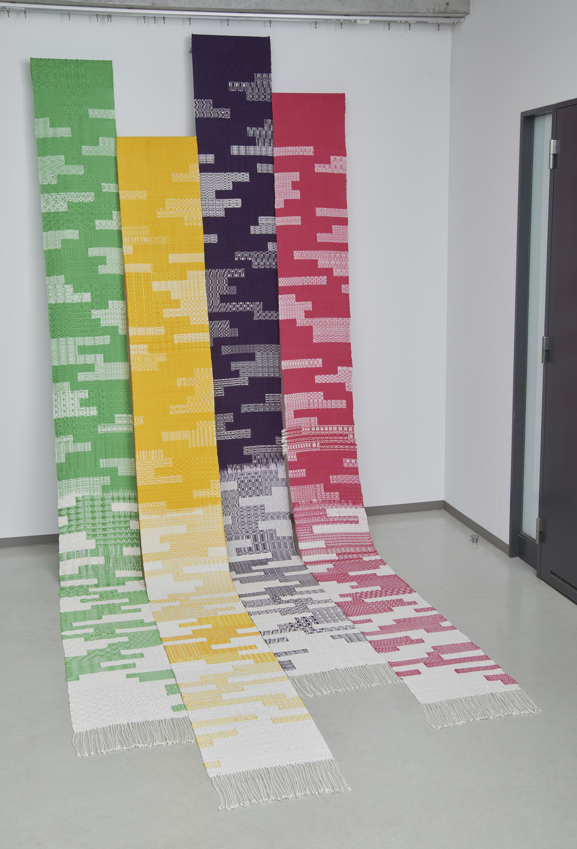 身近にある琵琶湖は季節、天気、空気、光によって刻一刻、様々な表情を見せる。高所から眺めると、琵琶湖にはいろんな方向からの流れが見られ、そこに光とかげが微妙に重なり合っている。そして動きのある湖面が、一瞬時が止まり静けさを感じさせる。絣の技法を使い雄大で静かな琵琶湖を表現しようとした。