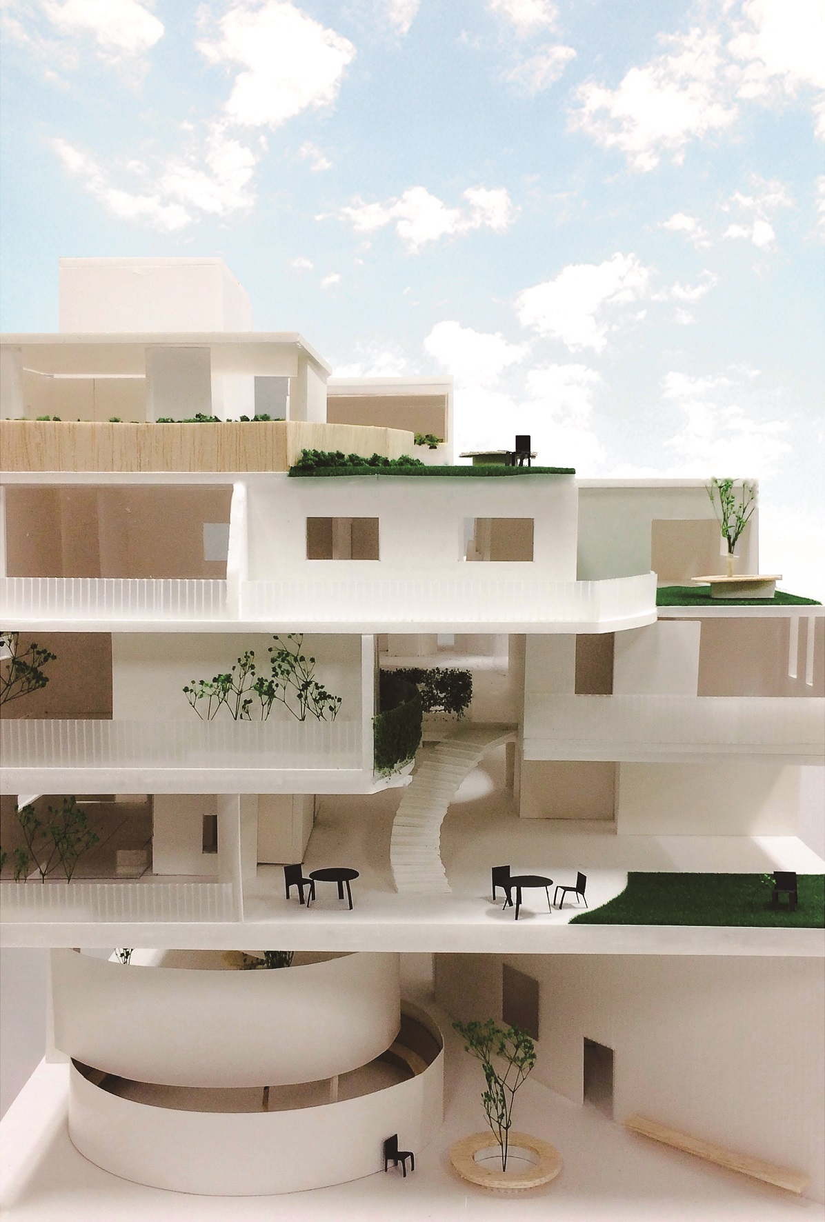 街と人との距離を考えた。街は人と、人は街と、もっと近づきたがっている。そこに近づくきっかけが無いだけなのではないか。建築はやさしく人を受け入れ、育て、包み込むものなのではないか。建築が人と街を近づけるきっかけになることを目指した。