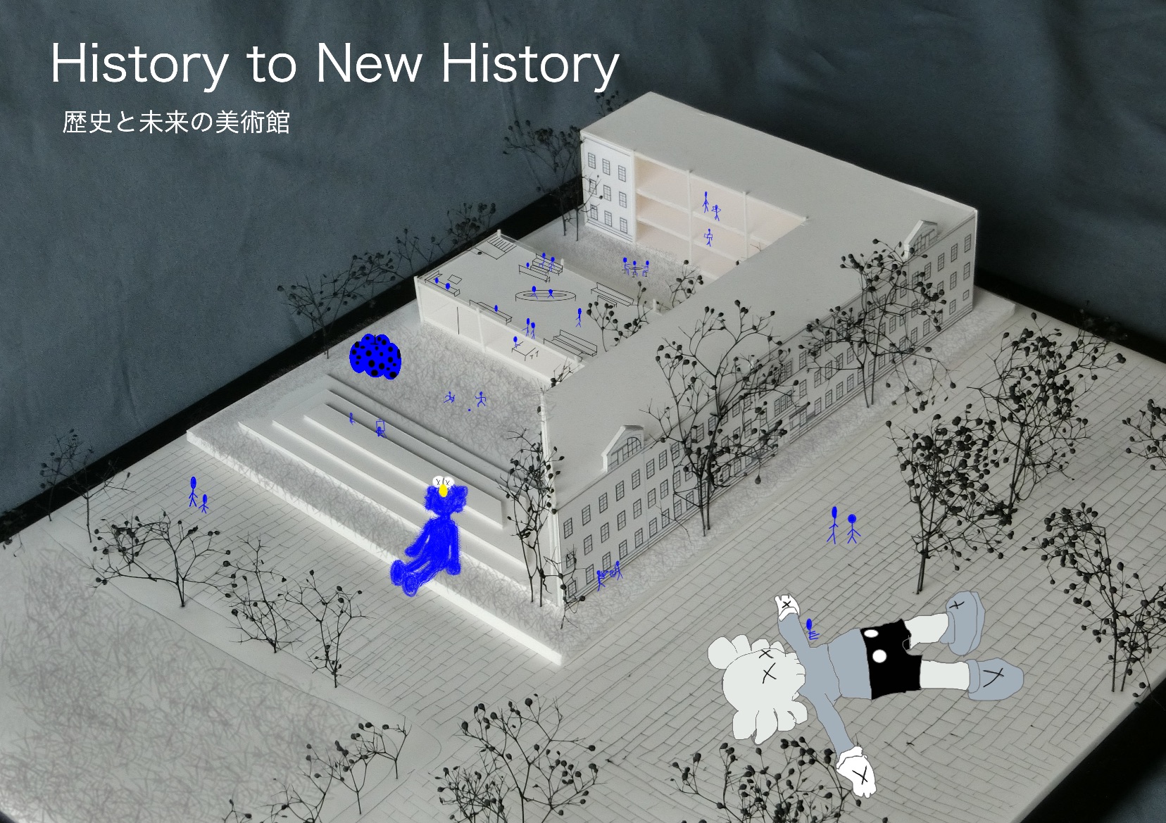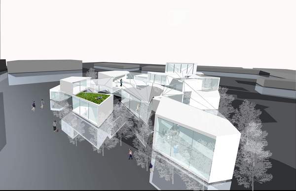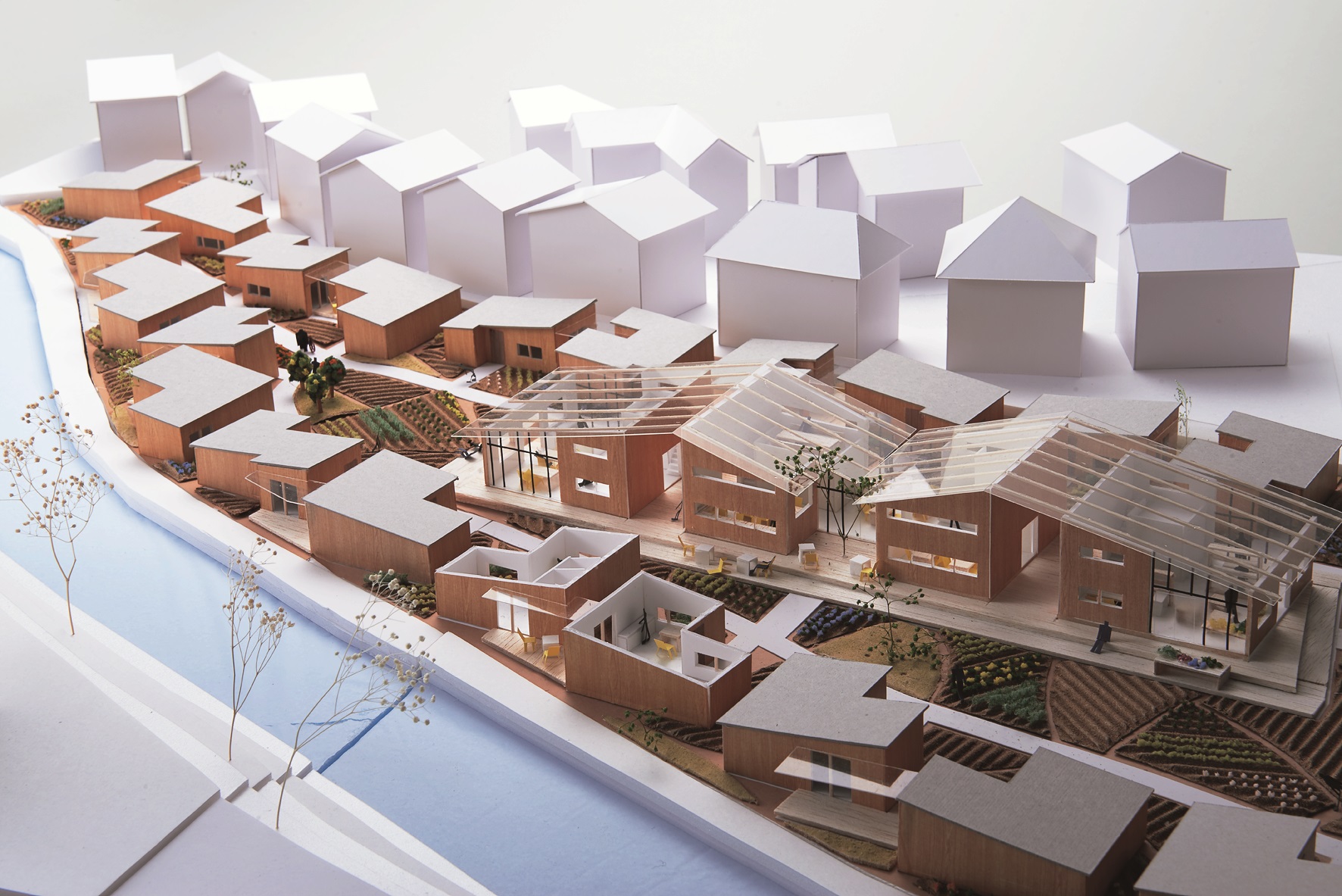 ひとびとを閉じ込める建物ではない、流れを持つ交差点のような空間が地域の繋がりを蘇らせる。小学校、劇場、老人福祉施設という機能が、それぞれ畦道の走る田んぼ、水流を見晴らす橋、桜並木に囲まれた広場という自然を孕んだふれあいの場となる。
