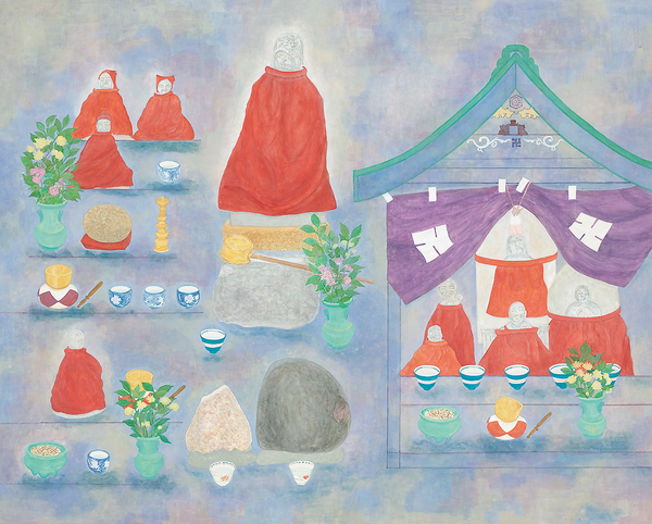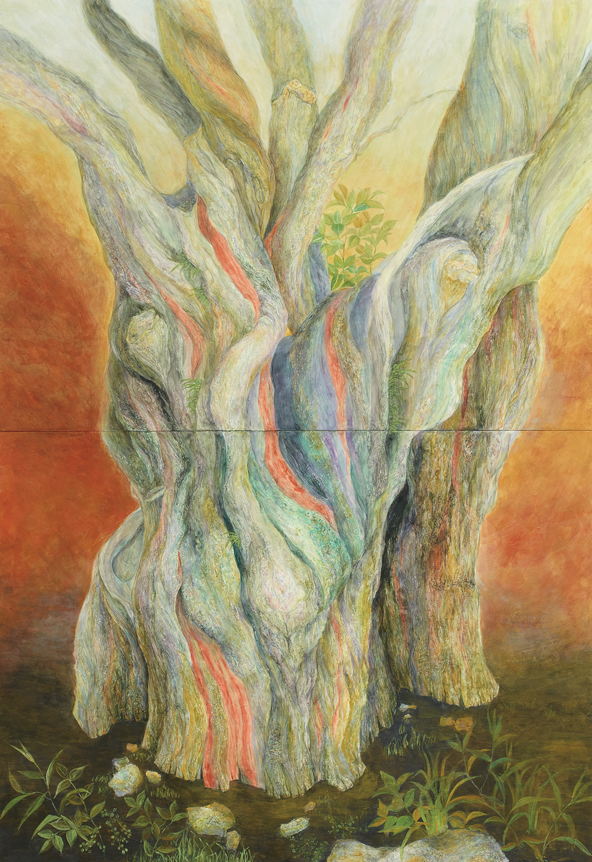 愛知県一宮市、長誓寺の垂れ櫻です。樹齢250年余、その幹は一部は朽ち果て、苦しそうに曲がりくねり、それでもなお、新しい若木とともに枝を四方へ伸ばし、春には狭い境内を埋めつくす程の花を咲かせます。長い時を生きぬいてきた櫻の神々しさと、惜しげもなく一斉に咲き誇る花に魅せられて描きました。