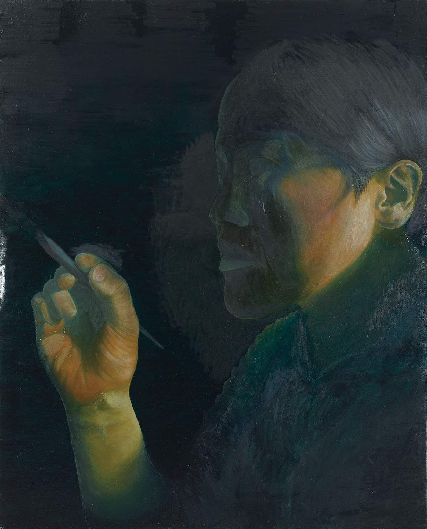 絵は平面の二次元である。この二次元的空間をいかに三次元的方向へ観せるか?故郷の遠い記憶をブルー色で表現した。色と色、あるいは形に必然性があると色と自分が結びついている。色や形に必然性があると時間が感じられ、空間が感じられる。遠い記憶の中で人間の物と物のむすびつき、絵具と絵具のむすびつきを三次元に見出すことができないか。