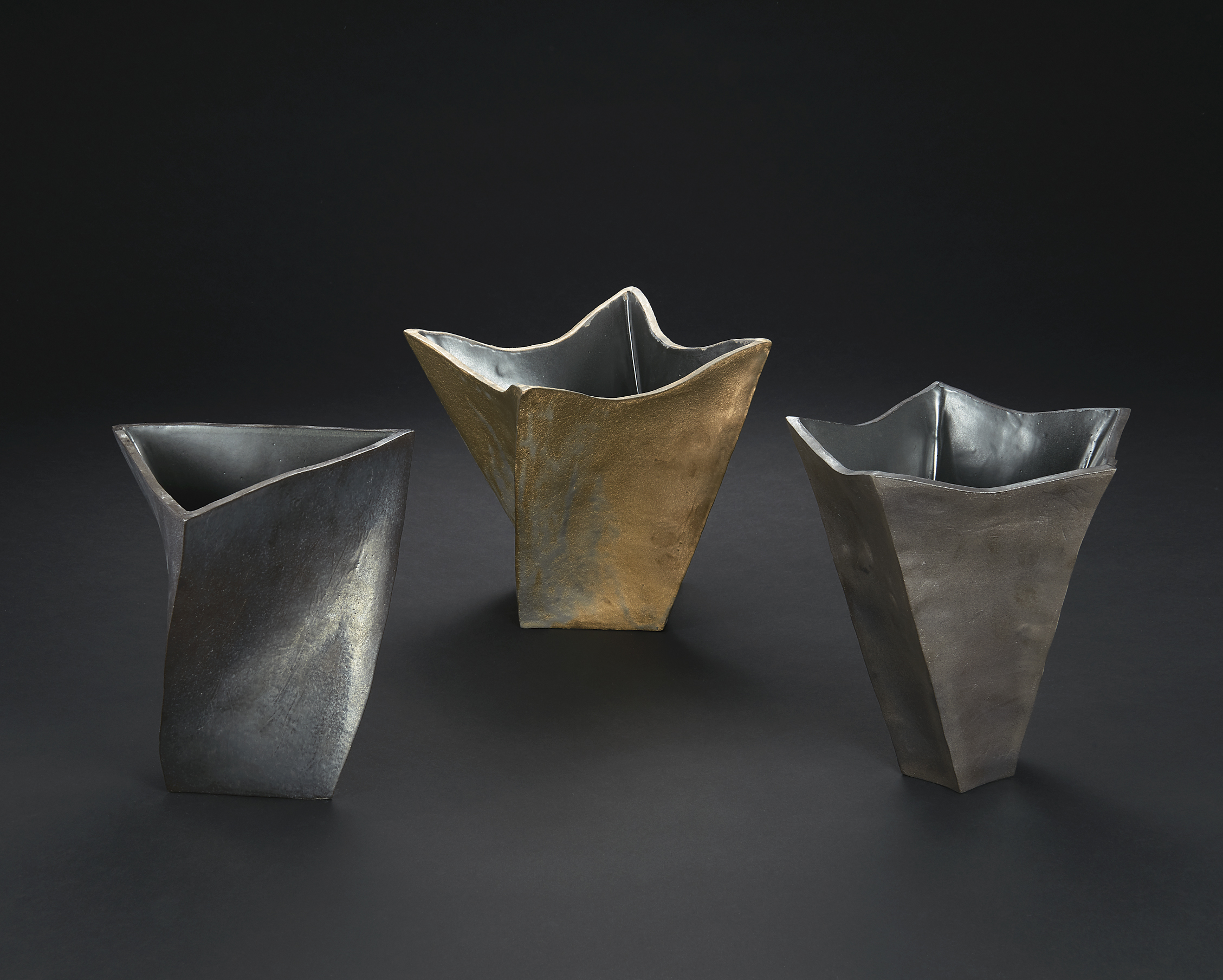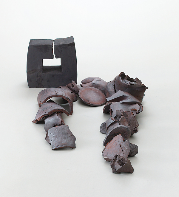 オブジェとオブジェの間に生れる空間を意識しながら制作した。稜線がキリリと出るように努力したが、粘土が軟らかく崩れるのでカーブがうまくだせなかった。乾燥を待ちながら何度も作り直した。作品は、苞に温かくつつまれた蕨の若芽をイメージしている。