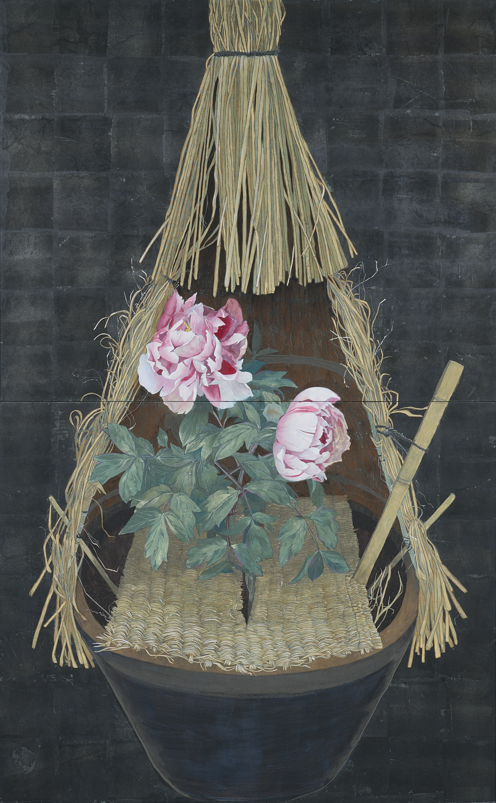 在学中に描きたいと希っていた牡丹をようやく実現できました。紅い花のいきいきとした姿と、白い花の清々しさを、あらわしたいと思いました。