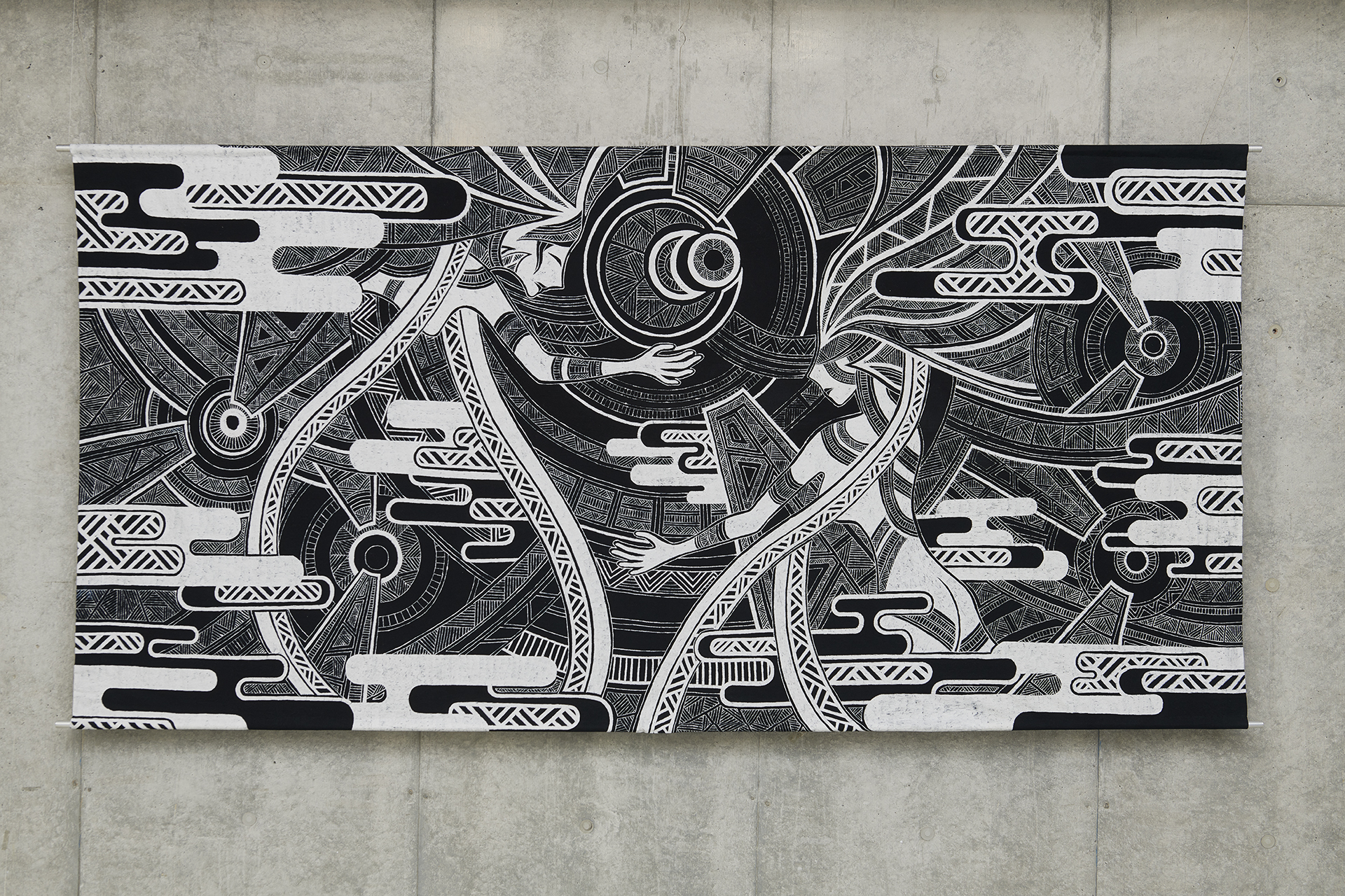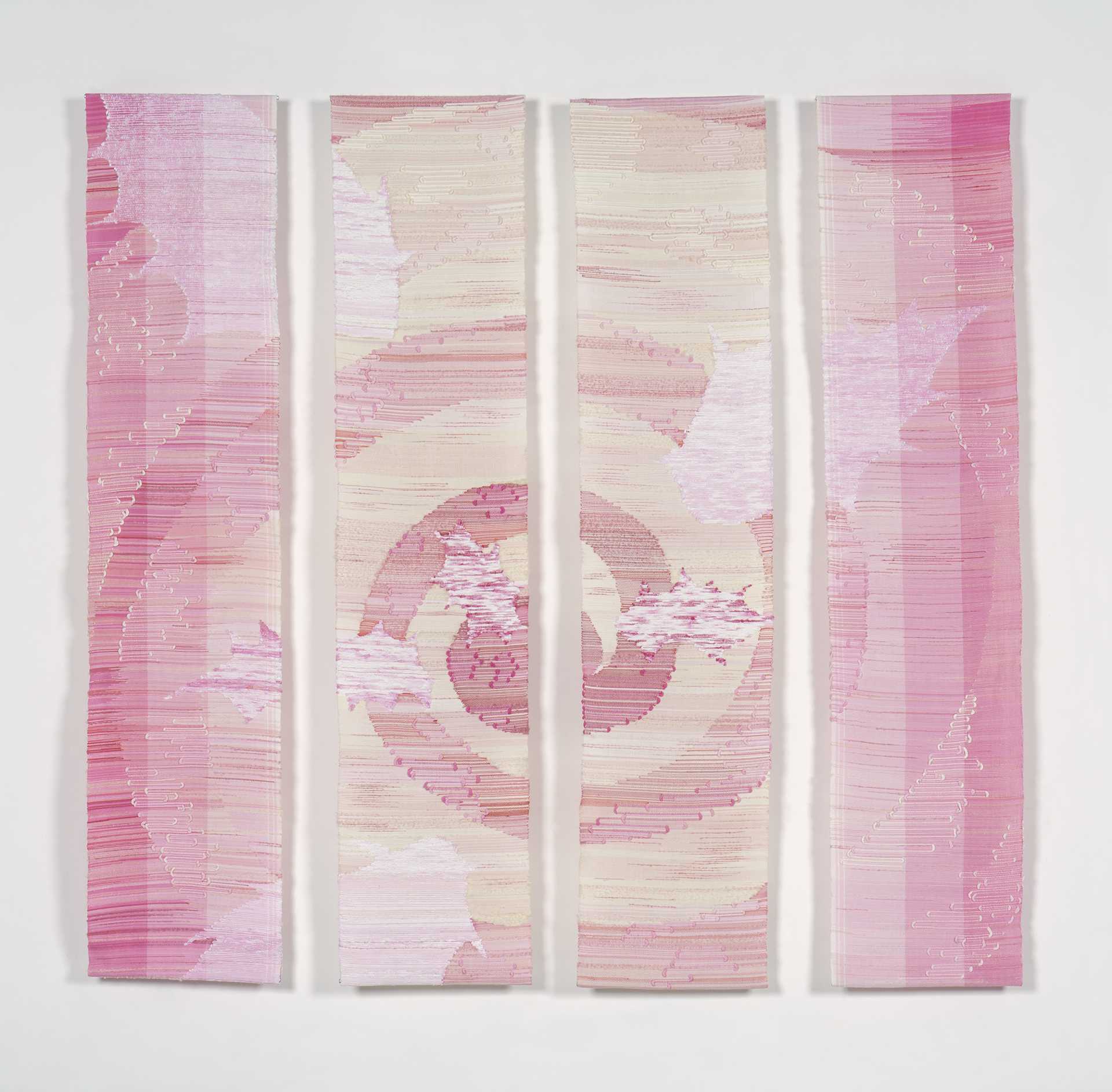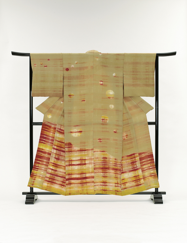 折りたたんで、繰り返される形のおもしろさ、天然染料の変化の不思議に魅せられ、形と色の変化を表現した。