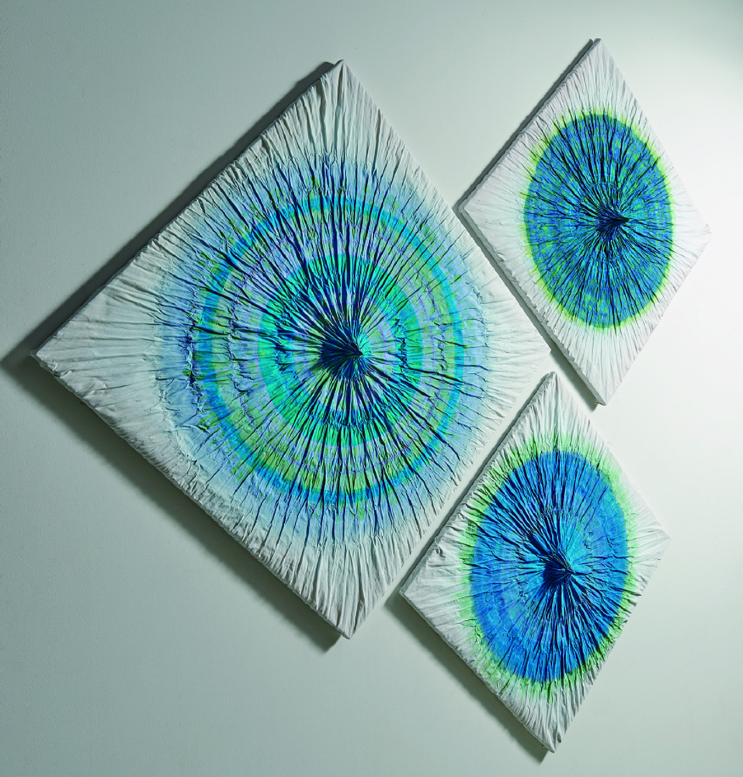 布を何枚か重ねて縫うと布の厚みによって表面にしわができる。そのしわの模様がおもしろいと思った。縫った布にろうをおき、その布を染めてしわのおもしろさを表現した。