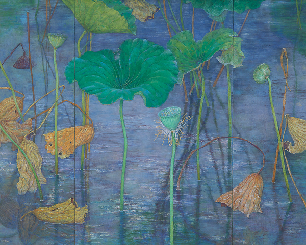 日常は遠くから眺めている山ですが、この度は麓まで出かけてこのアングルに出会いました。山の頂から麓まで雨が山の裾を流れ下り、下流では立派な川になり田畑を潤す。そこには人々の営みがある。山は秋色、川に張り出した堰とみられるコンクリートに腰を下ろし、故郷の山と川を画面に吸い取ってしまおう、そんな気持ちで制作する。