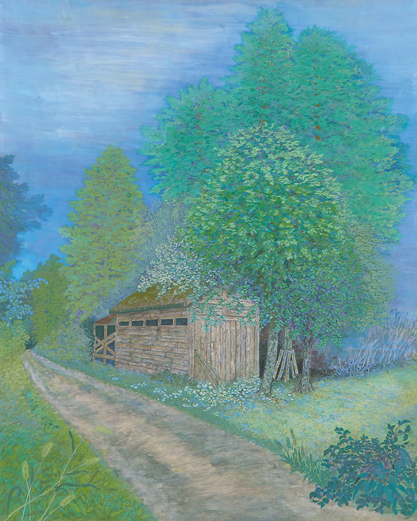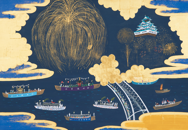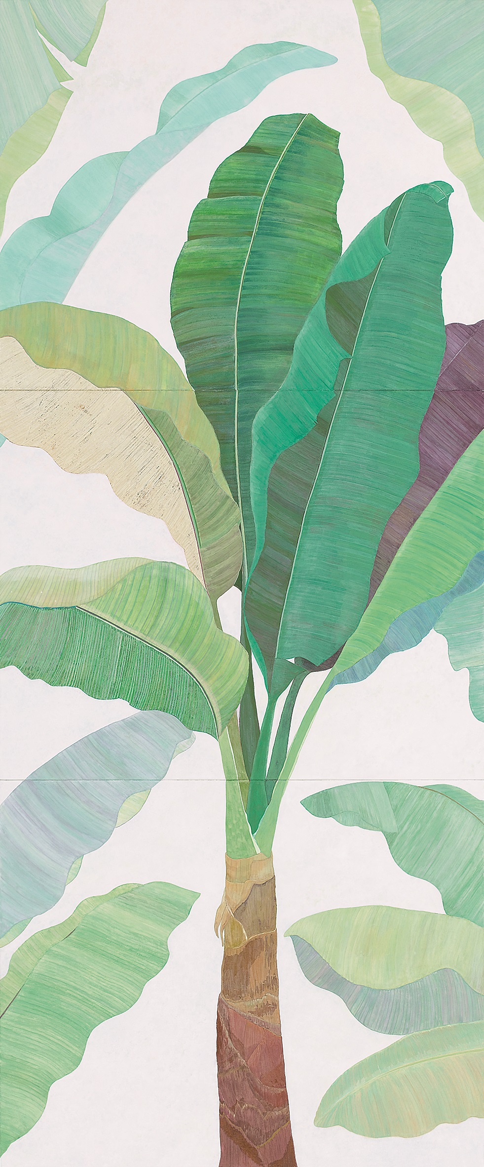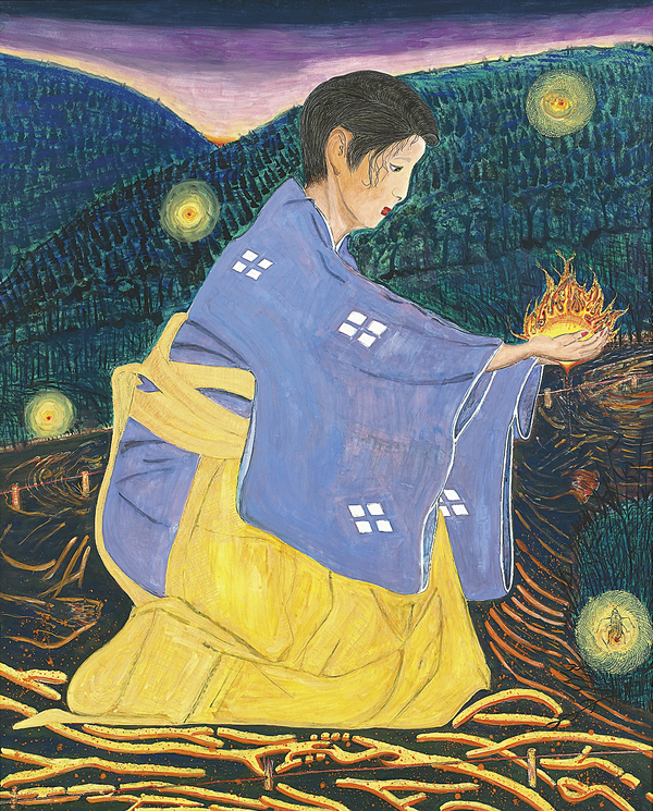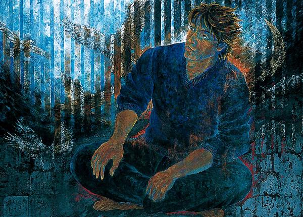 大好きな花「椿」を描きたいと思い始めて何年になるだろう。色紙や小品は何枚も描いてきたが納得いくものはなかなかできなかった。大画面いっぱいに椿を描きたいとの思いが卒業制作で現実のものとなった。主役の白い椿を引き立たせるため金箔を背景に使ったが、思った以上にむずかしかった。椿の美しさを自分なりに追求できたことに満足している。