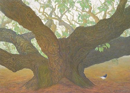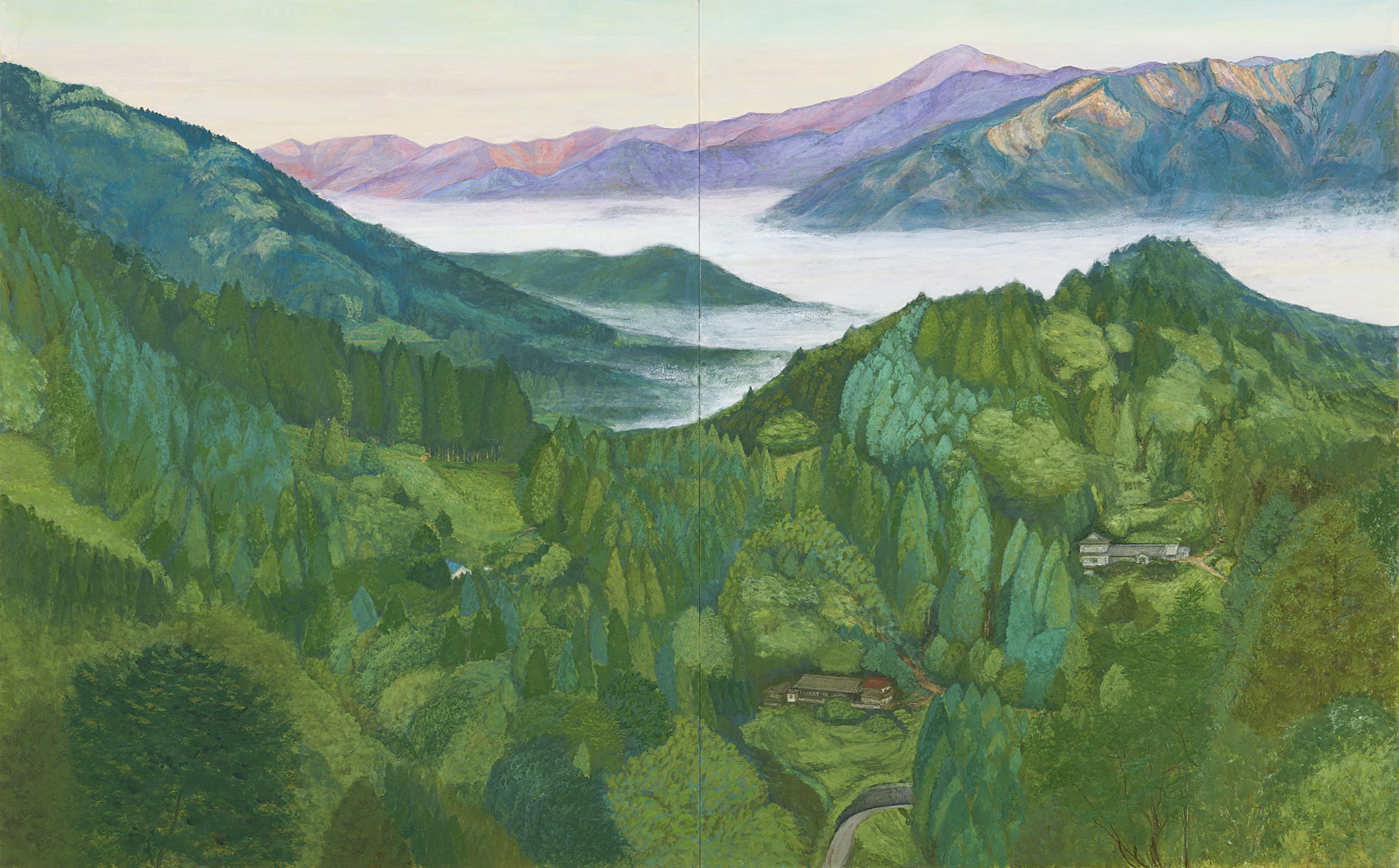 群馬県と栃木県の山間を走る、わたらせ渓谷鉄道の「沢入(そうり)」駅の小さな待合室は、大きなモミと桜の木に守られるように静かに時を刻んでいた。風雨に晒された木造駅舎の凛とした重みのある姿に心ひかれ、夢中で描いた。忘れかけていた木造建築の懐かしさと温もり、駅舎を包む緑と光のベール。素晴らしい宝物に出合った。