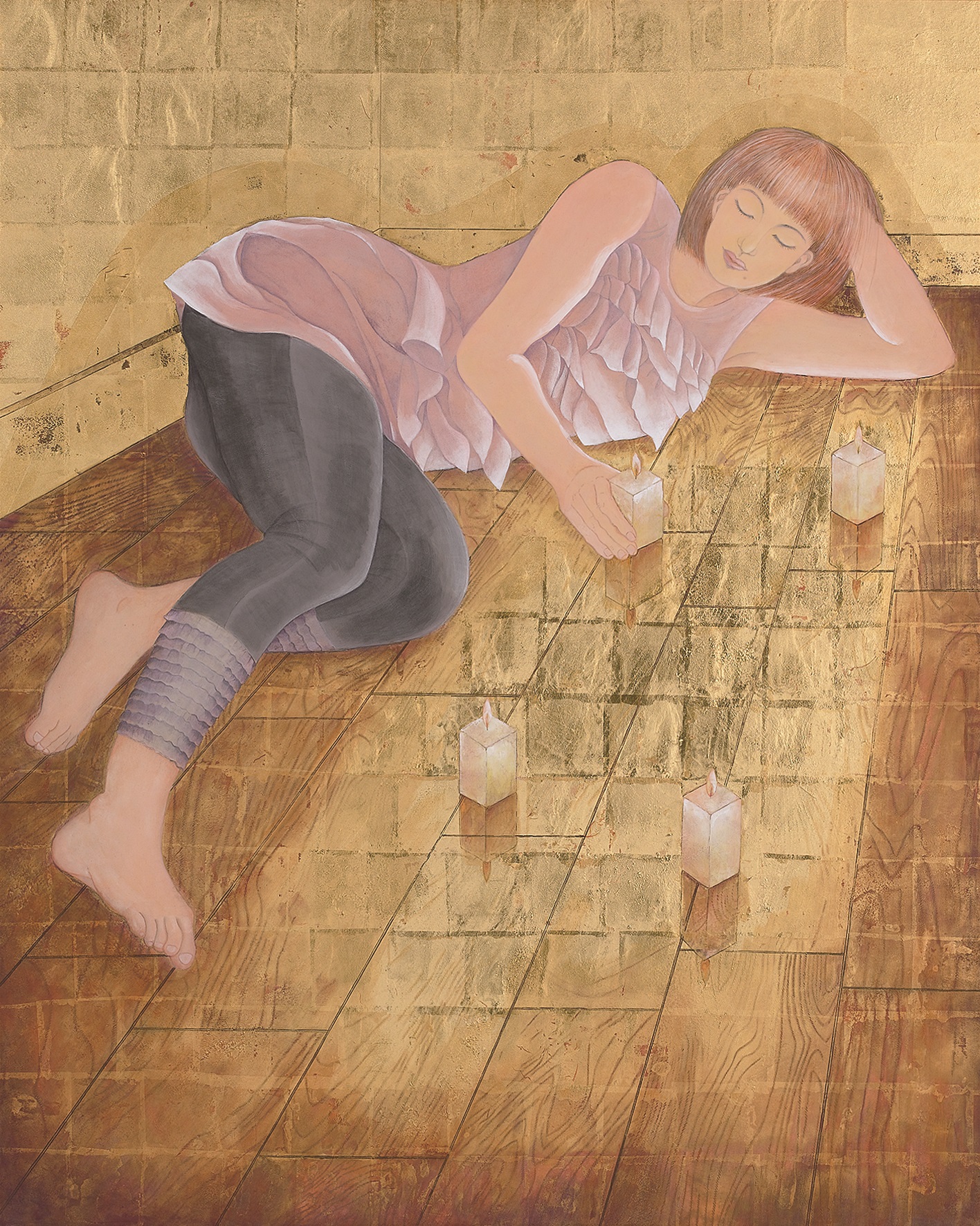 椿の真っ赤な花に染められた木々、花に囲まれた中で花遊びをする二人の女の子。花の精かと見まがうばかりである。清らかさとあどけなさが、描けただろうか。庭には今年もたくさんの椿の花が、咲いている。寒い冬の花であるが、暖かい春を予感させる可愛い二人の天使である。