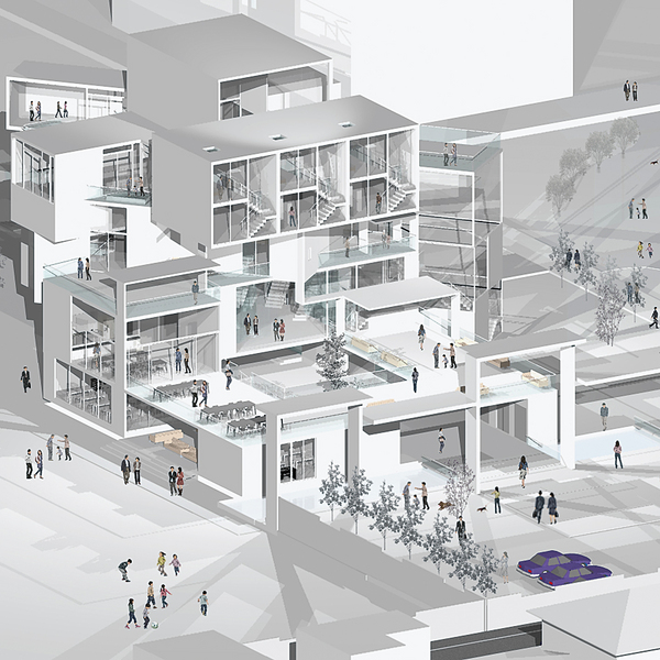 仙台市は昔から「杜の都」と呼ばれてきました。定禅寺通りは、幅が46メートルもあって、その両側と中央の遊歩道にのびのび育った二重の欅並木が続いています。季節ごとに美しい姿をみせながら、様々なイベントで人々を楽しませてくれるこの並木道の気持ちよさと魅力を思い出しながら、三つの建物を計画してみました。