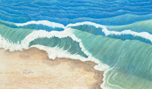 「祈り」を込めて、心の奥にある想いを神話的・宗教画的に描きたいと思い創作しました。4年前に亡くした大切な命。冥福そして復活の願いを刻みました。『どうか、天国で幸せでありますように。生まれ変わって誕生する時には、たくさんの愛に包まれて何事からも守る強い力に包まれますように』 祈りの優しい風に全ての想いを込めました。