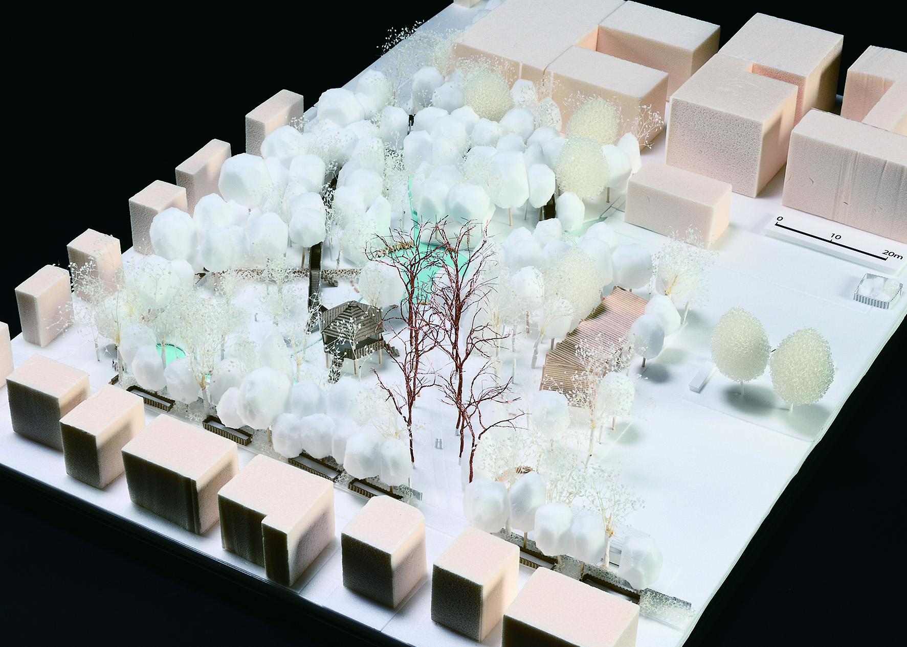 かつての川湊の風情が失われる中、芭蕉が訪れた奥の細道むすびの地を活かした市街地回遊の拠点整備が進められている。消えた舟入の復活をキーワードにすり鉢状の地形を濃尾平野に見立て空間をデザインした。春、まだ白い伊吹山を背景に美しく咲き誇る水門川の桜並木と共に地域にふわさしい景観要素を織り込みながら、にぎわいの再生を提案する。