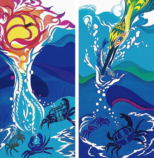 夜明けに一瞬垣間見た東雲の襲いろに心を奪われ、荘厳な自然が織りなす一期一会の世界を着物というキャンバスに描くように経糸と緯糸をかさね表現した。