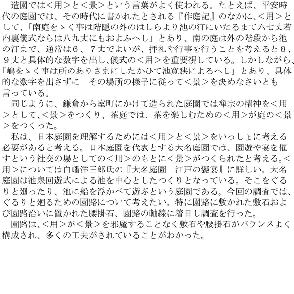 私のランドスケープデザインを勉強する目的は自宅の庭に自らがデザインした空間の創造であった。旅で出会った自然の流れと迫力有る大きな景観を自宅の狭小空間に実作すること、それは自分の芸術性と4年間の大学で学んだ色々なことの集大成である。老後の生きる糧を与えてくれる変化する庭、成長する空間でもある。