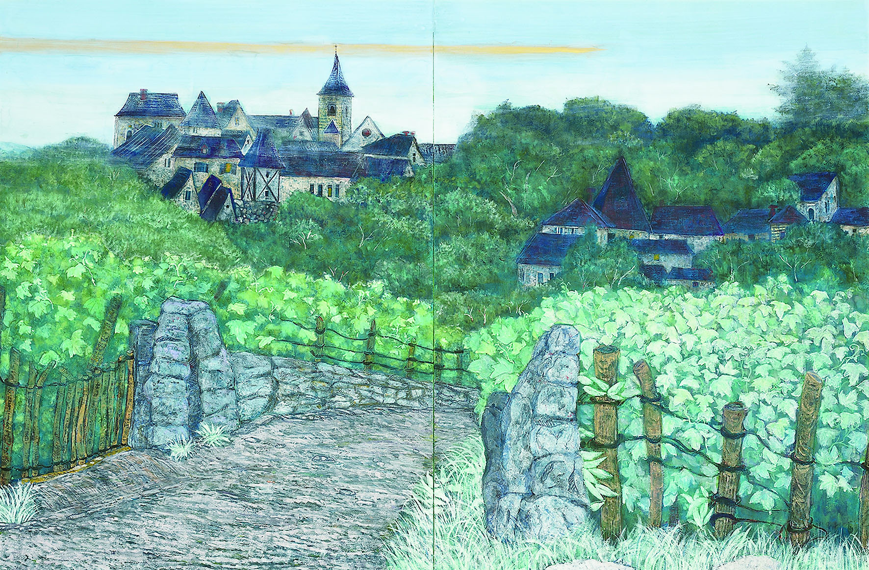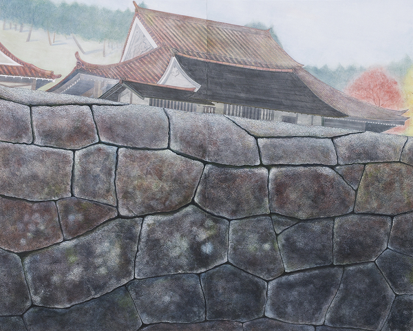 備前の国「閑谷学校」は世界最古の庶民のための学校である。藩主池田光政が儒学に基づく平等の教育を目指し、この閑谷の地に開いたのだ。私が描いた石塀は何千年の歴史を経て石となり、堅固な故に石塀と変身し、310年もの間学校を守ってきた。私はこの強い意志と深い歴史をもった堅固な石たちと問答しながら、畏敬の念をもって描いた。