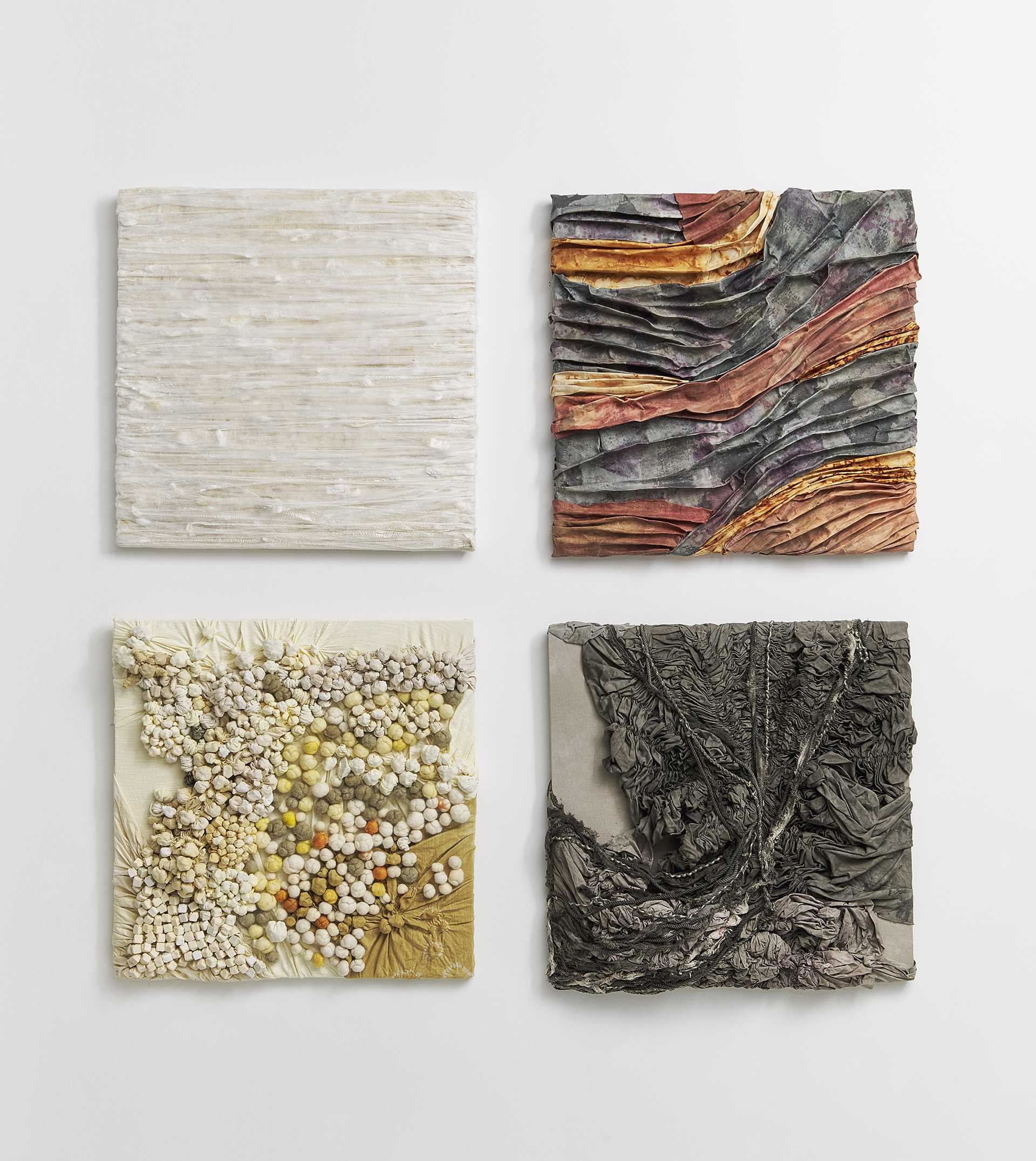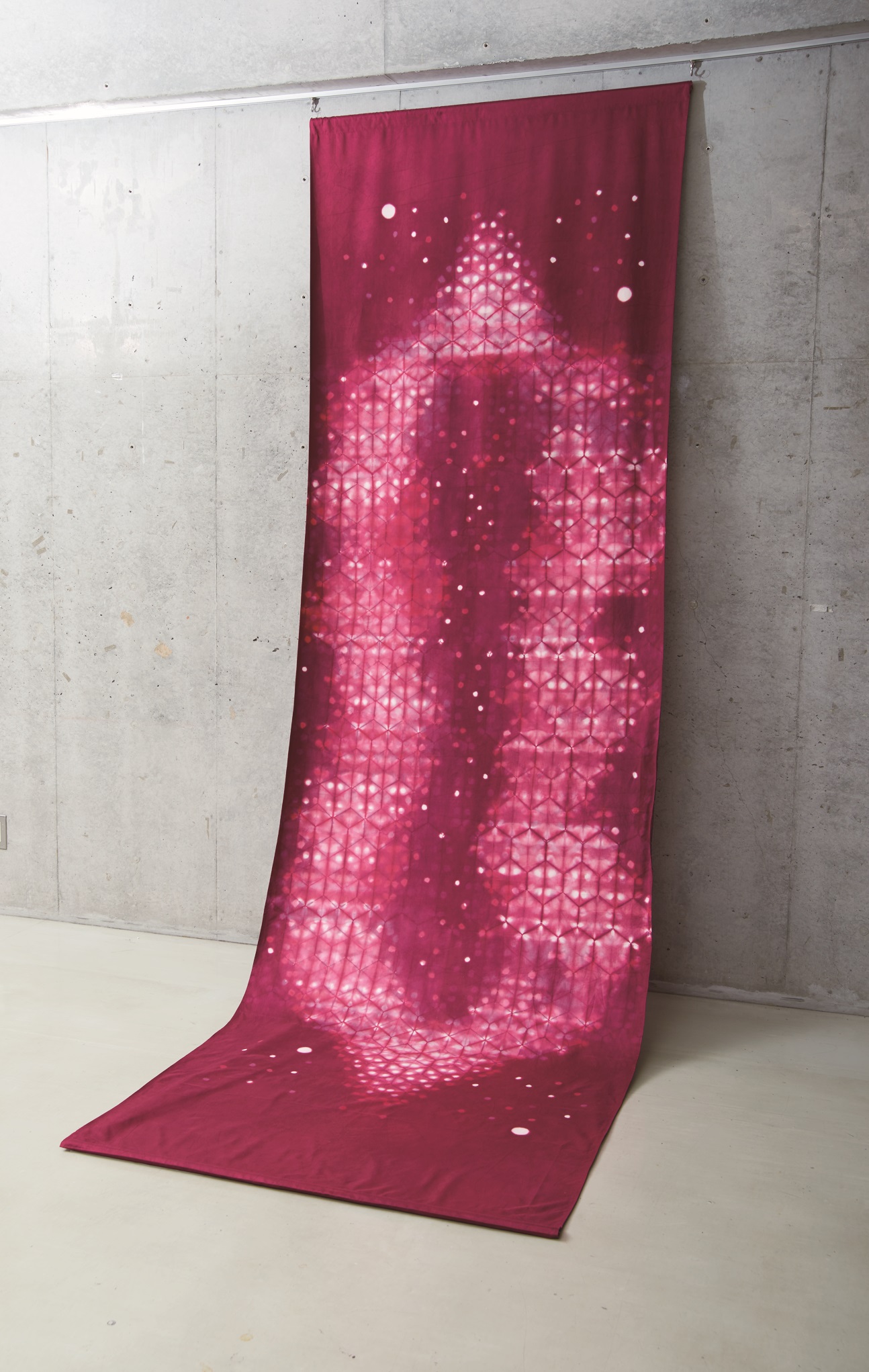 太く高々と育った欅、狭い空間をくねくねとよじ登るようにのびた桜、伐採された部分を必死に繕ってきた老獪な楠、春を待つ公園の一隅である。長い年月を経て古色を帯びた木々の芽吹き前の生命力を裂布で、早春の空気感を毛糸で表現したいと考えた。木立をぬけるやわらかな風と光にどこまで迫ることができただろうか。