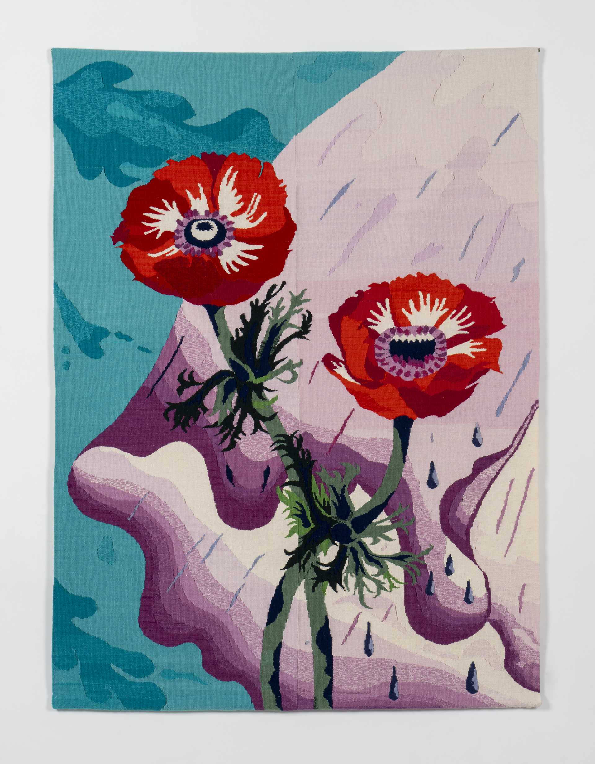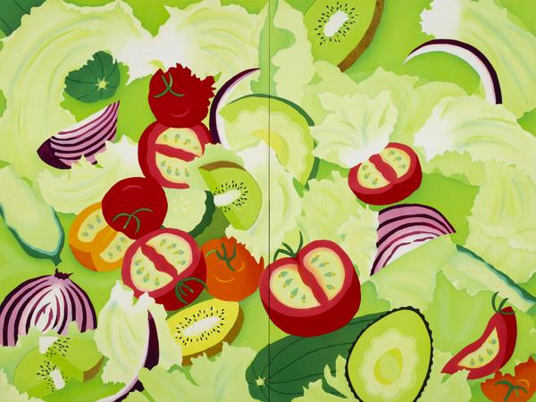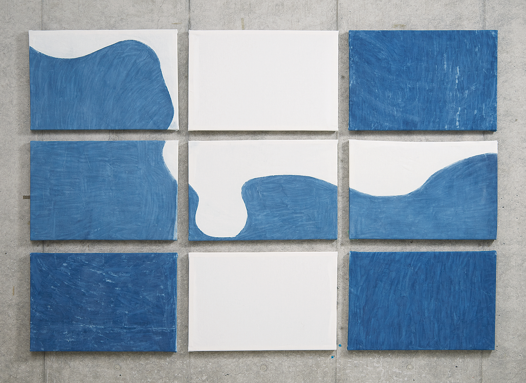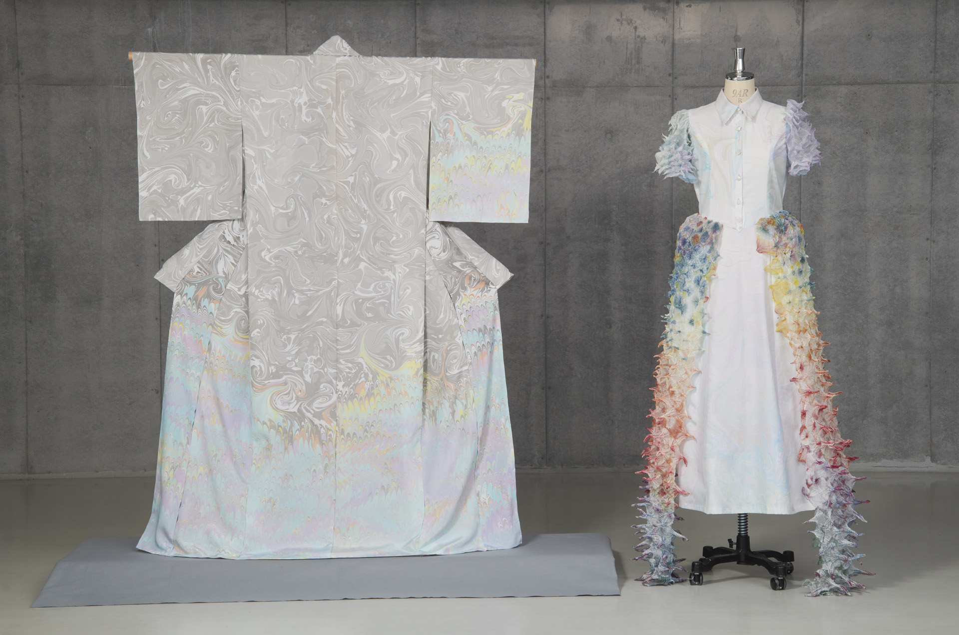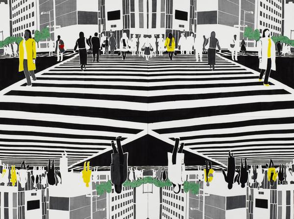宿泊先のホテルの玄関からフロントまで続く細長い流線模様のフロアを前にして、頭の中に様々な思いがかけ巡った。染と出会うきっかけになった友禅流しの光景や絡み合う流線が自分の人生にも思えたのである。この思いを型染の力強い表現で一つの画面に表わしてみることで、自分と向きあってみようと思ったのである。