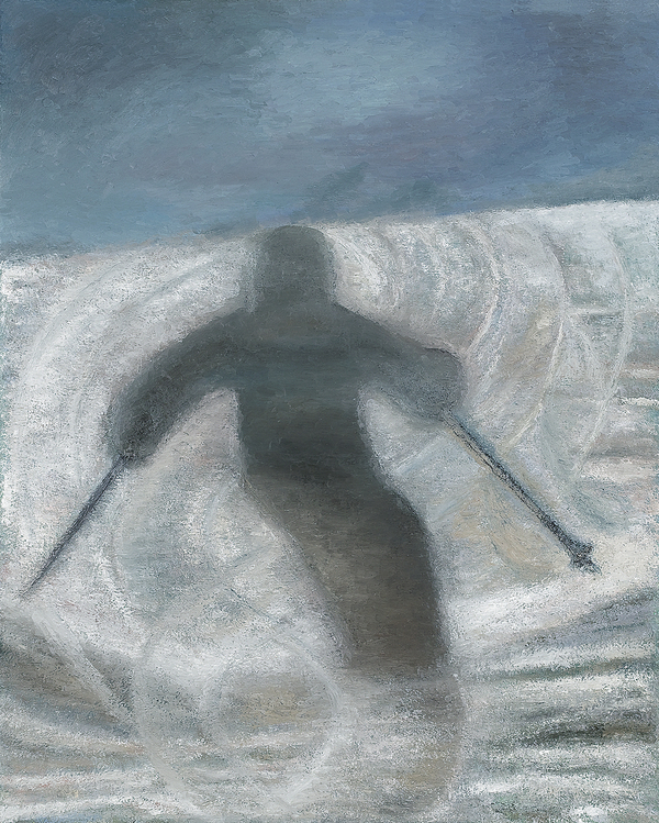 朝もやの中、古木の切り株に足を止めた。木肌が化石のようで造形的な模様、色彩に満ち、今尚、凛とした風格を備えているのに魅了された。古木は、森に漂う、得も言われぬ香りとシュルシュルと音を出しているかのような、目に見えないエネルギーに取り囲まれて、鎮座していた。そんな情景も含めて表現してみた。