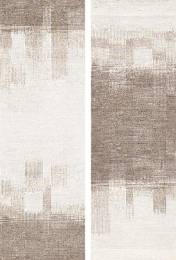 光と風を全身にまといたいと云う思いから、着物の形態とした。季節の訪れを、光と風が知らせてくれる。光の粒がキラキラと降り注ぎ、風がゆったりと身体を通り抜けてゆく。経絣によって光を、緯絣によって風を表し、空気感を表現することを目指した。