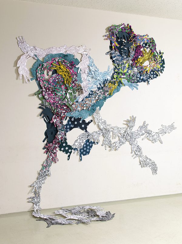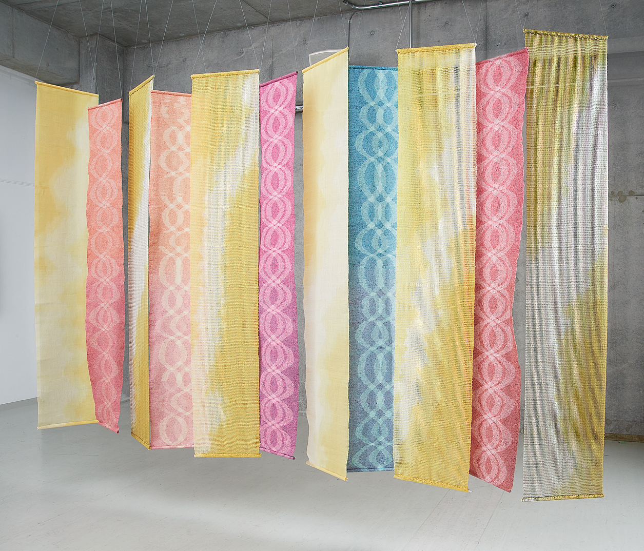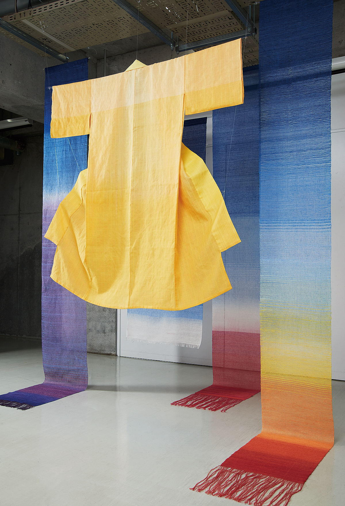 北海道ニセコにある目国内岳(メクンナイダケ)の奥のパンケメクンナイ湿原を訪れた時の感動を表現しました。早朝のあけぼの色のなかに咲いていた山野草や水草、湿原の中をゆったり流れていた小さな川を思い出します。糸で絵を描く気持で染め、織り、着物にしました。藍の生葉を送ってくれた友人のおかげで、全体の水色が意図した自然の色に近づいた気がします。