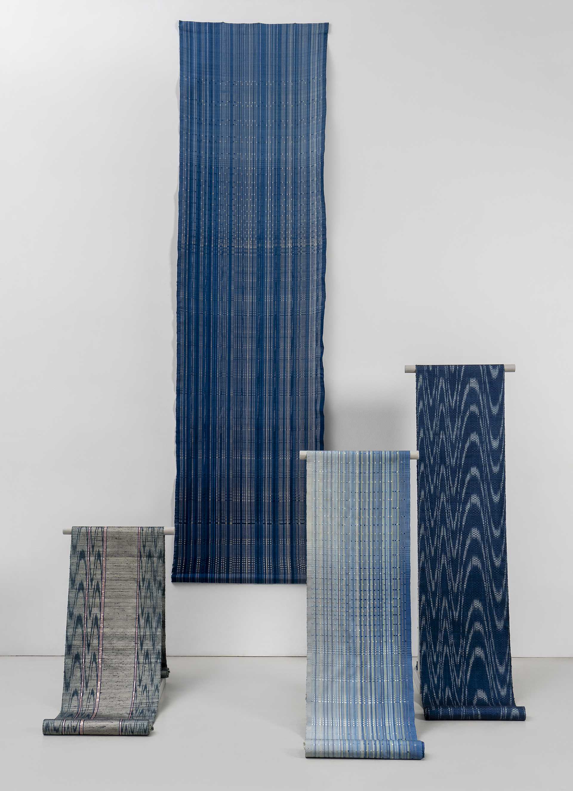 縫取織と経絣という技法の融合と関係性を対のタピスリーで表現した。前者は織りながら機の上で柄を描き、後者は糸の段階で柄を染めておく技法である。両者はキャラクターの異なる技法だと考えられる。一方のタピスリーは経絣を挑発するようにうねる縫取織との関係を表し、他方は経絣に優しく寄り添う縫取織との関係性を表した。