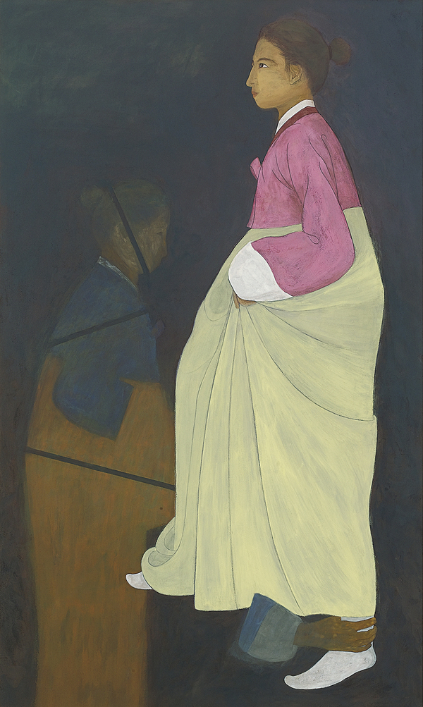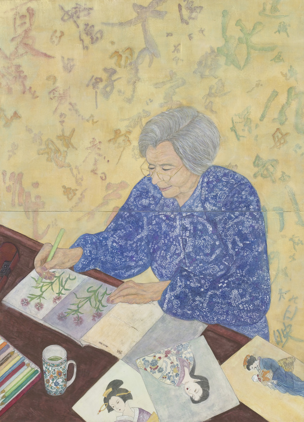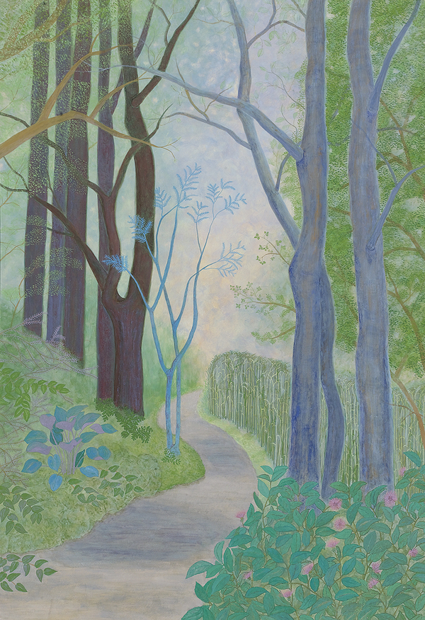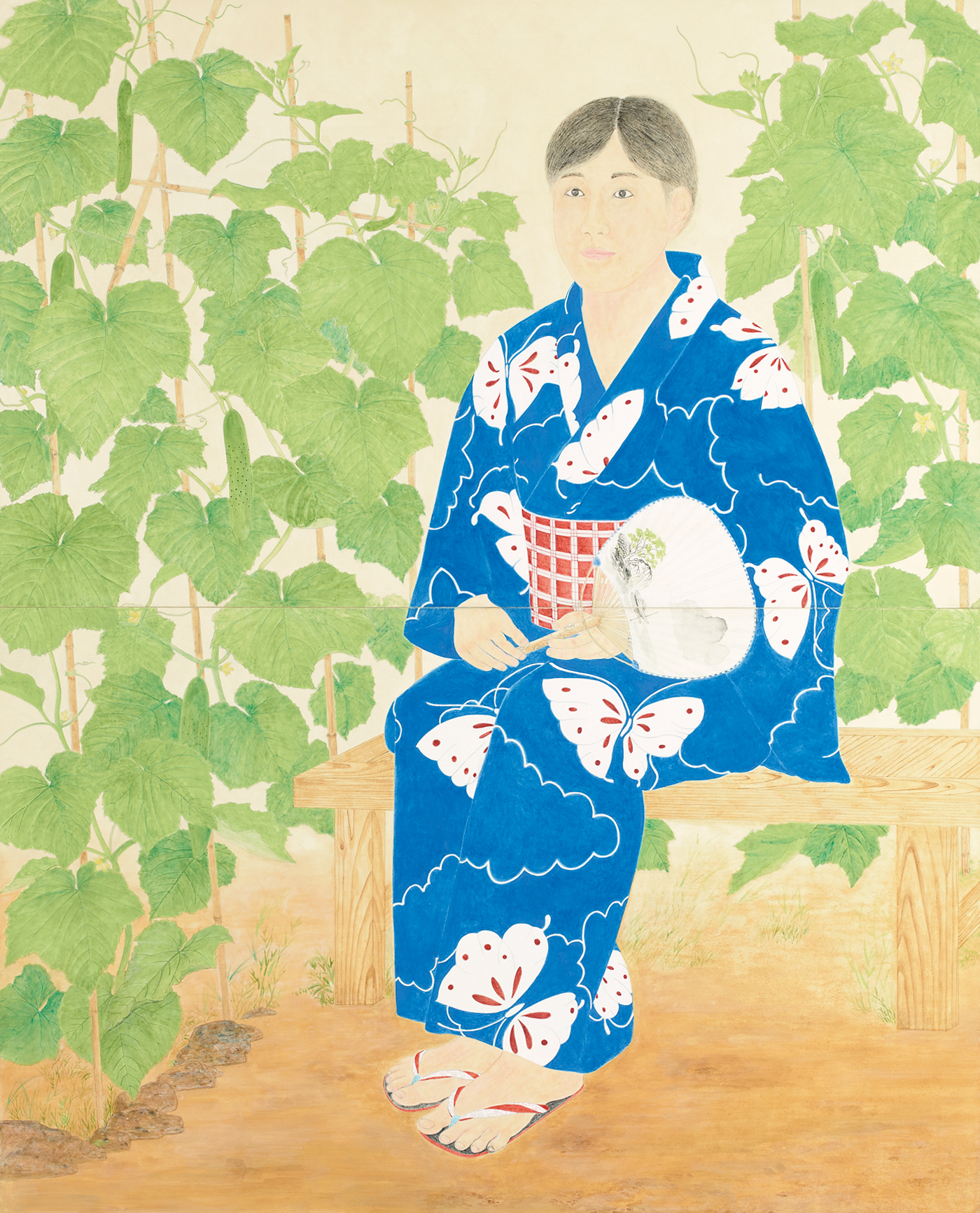 戦後70年という節目の年であることから、戦争の犠牲になられた人々の冥福を祈念しようと構想しました。7世紀の朝廷で歴史に翻弄され無念の死を遂げた大津皇子が眠る大和と河内の境にある二上山を、九州山地の中央部の当地にもある二上山に重ね、当地の高千穂神社の御神木とともに、「鎮魂」を表現しようと描きました。