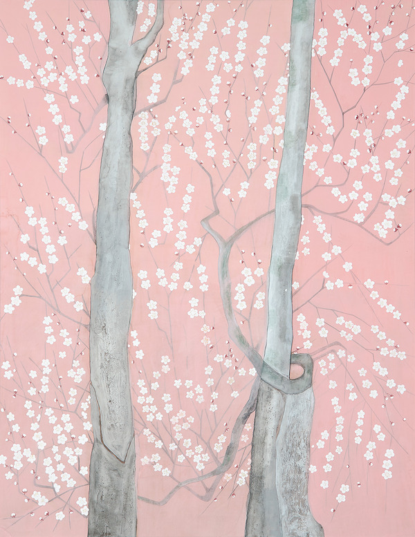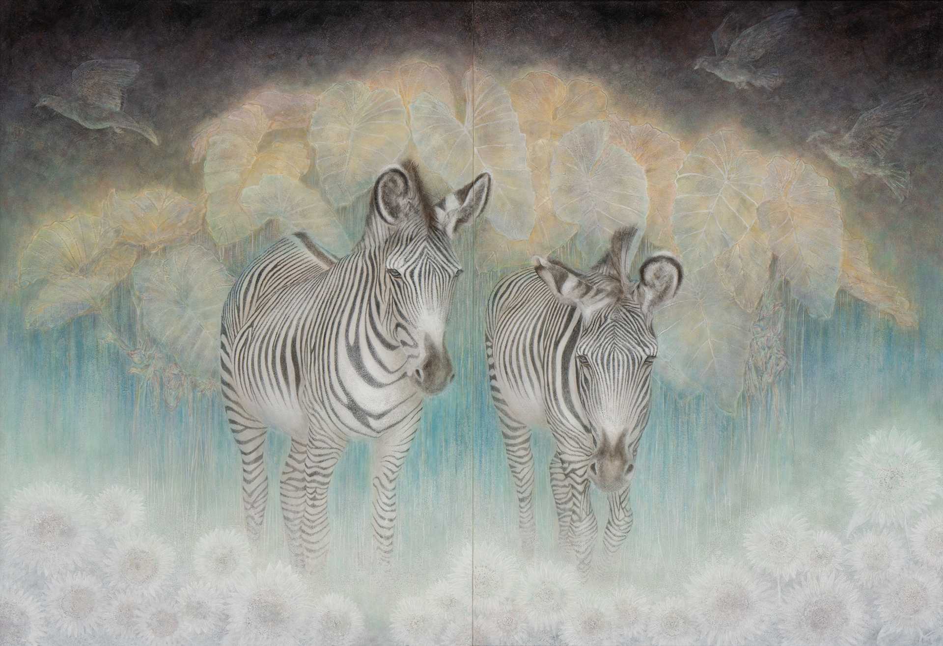 緩やかな山道を描きました。階段状になった石段と石垣は人の手が加えられ、石という無機質なものに温かみを感じます。右の杉の木は、深く根を張り毅然と天へと伸び、左の小川は山の水を集め、引力に導かれ流れ落ちる。対比するその真ん中にある路が何処かへと誘ってくれる。その先に光があると信じてゆっくりと僕は一人歩む。