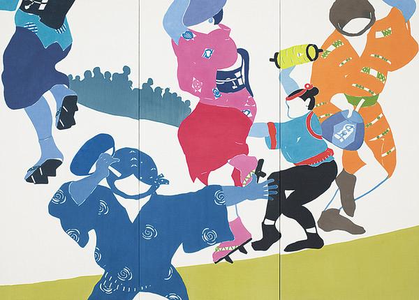嵐絞りを使った着物を制作した。全く染めない所や絞らずにただ染める所を加えることで、嵐絞りの柄がより映えるものにしたかった。染料は、嵐絞りを紅花、ストライプをコチニールで染めた。