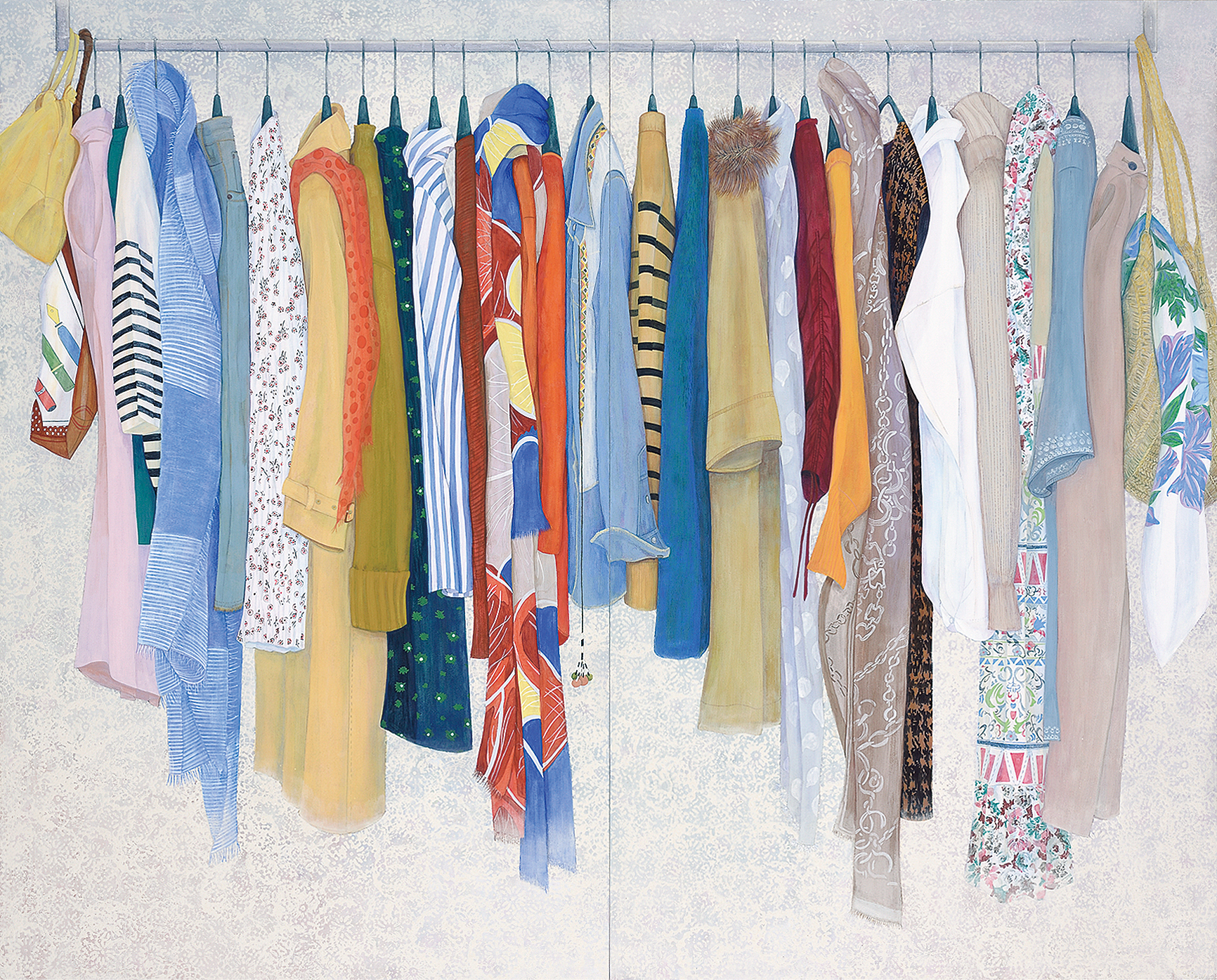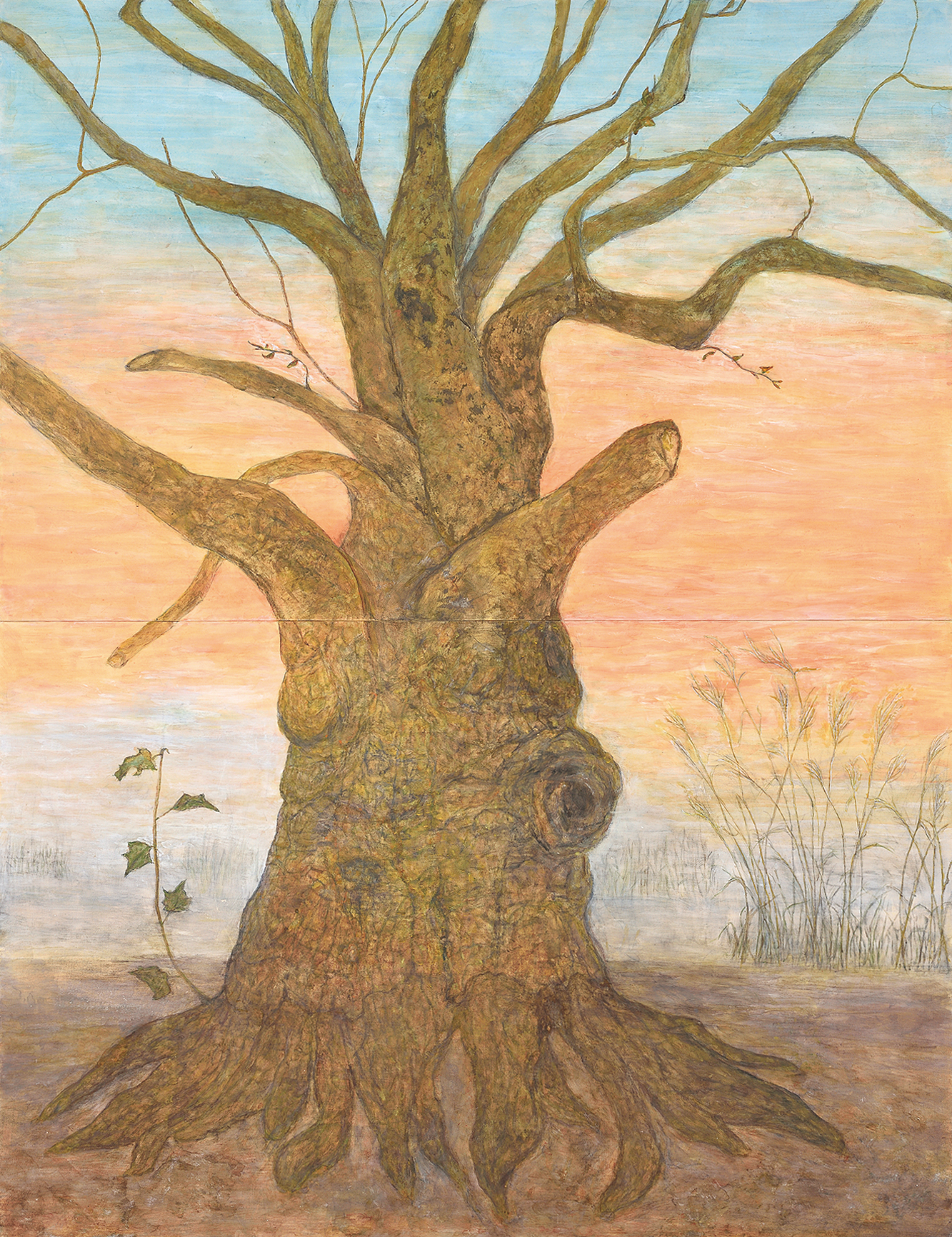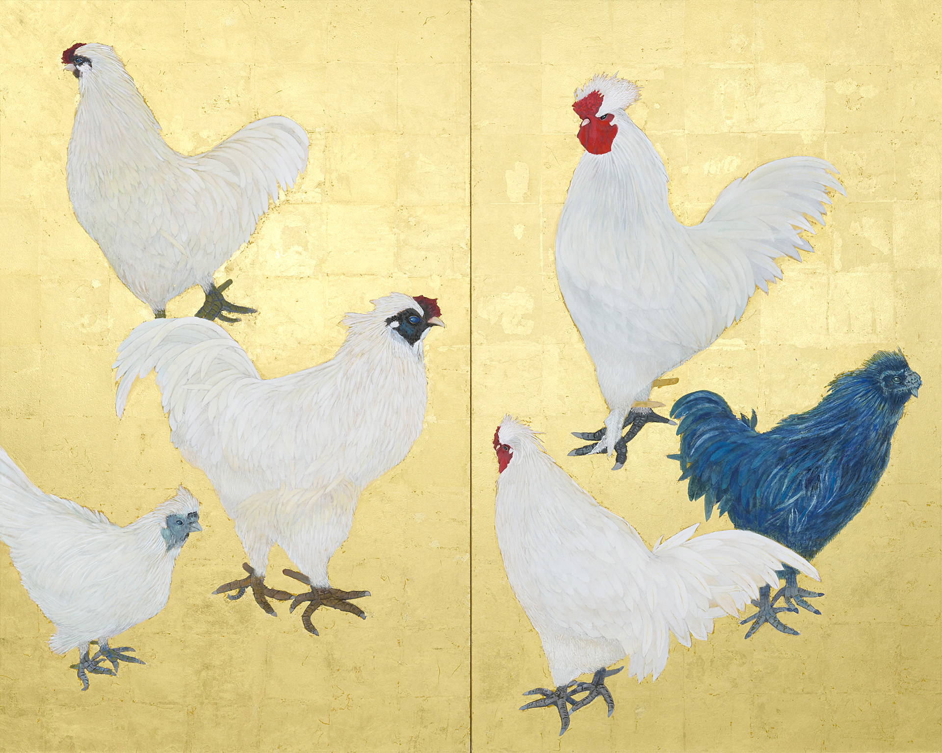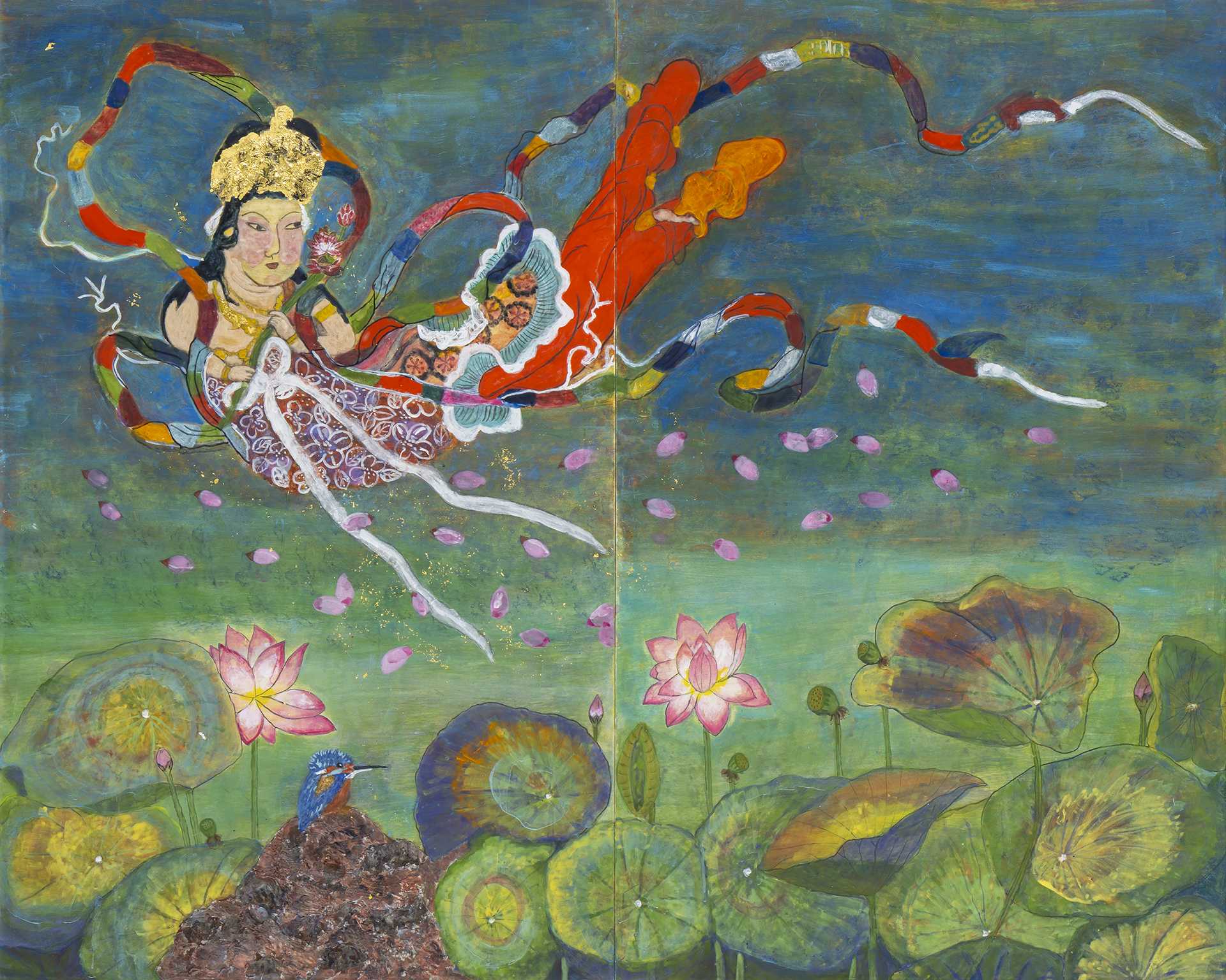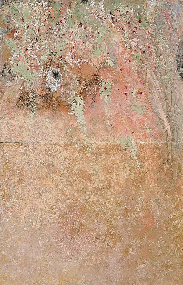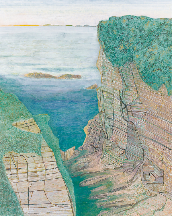 130.3×162.1cm 紙本、岩絵具・水干絵具・墨 写生旅行に尾道に行った。複雑な巒山や水道に囲まれた向島の造船所のドック運河・しまなみ海道の橋脚・家々が印象的であった。雨に烟る静かな風景の中に海に活きる人々の力強さが感じられた。今回も見たままを描くことに努めた。自分にとっての芸術性は見えて来ないまま制作を続けている。