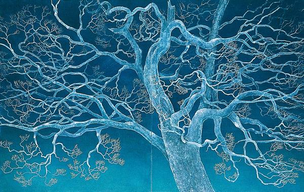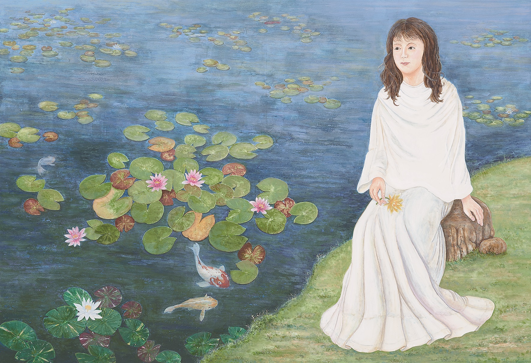 112.1×193.9cm 紙本、岩絵具・水干絵具 白と黒の縞模様が見渡す限り広がる有明海。ここで毎日くり返される潮の満ち引き。潮が引いた砂浜では、生まれたばかりの小さな水たまりが、じっと日の出を待っている。取り残された一筋の水の帯は、その光が届く前にそっと砂浜に消えていく。数千年の時の流れの中でくり返される自然の営み。―――私もその中のひとつなのである。