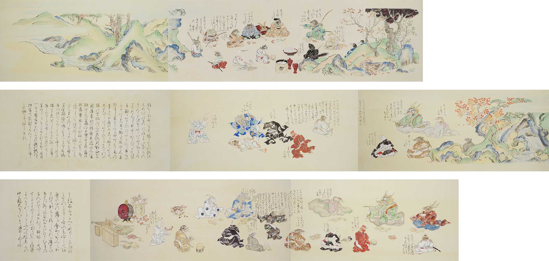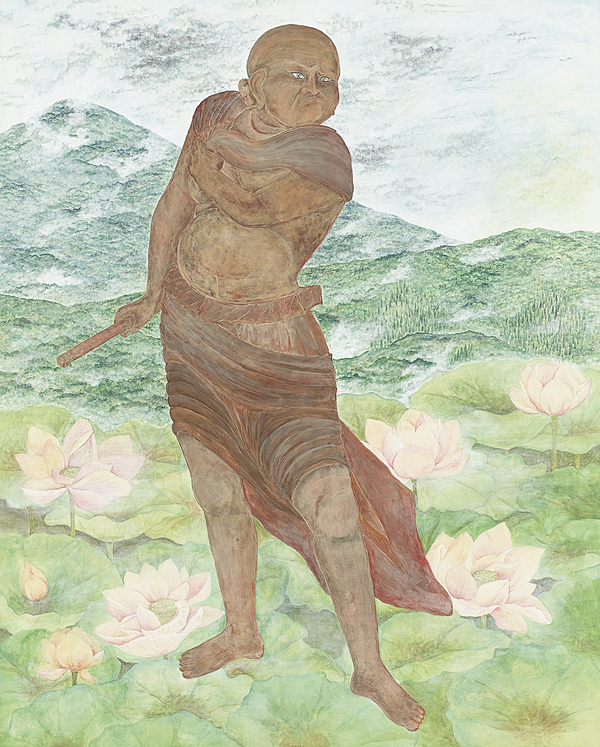130.3×162.1cm 紙本、岩絵具・水干絵具・墨・箔 いつの世も現在、過去、未来が廻っている。旅人となり見た、聞いた感動の一面を街景として表象。老いた今願う子供達の未来。安心安全夢いっぱいの街、街、街。念ずれば花ひらく日を信じて今日も旅人となり夢を追う。