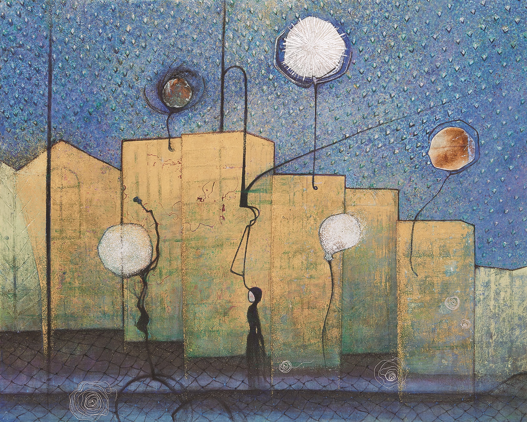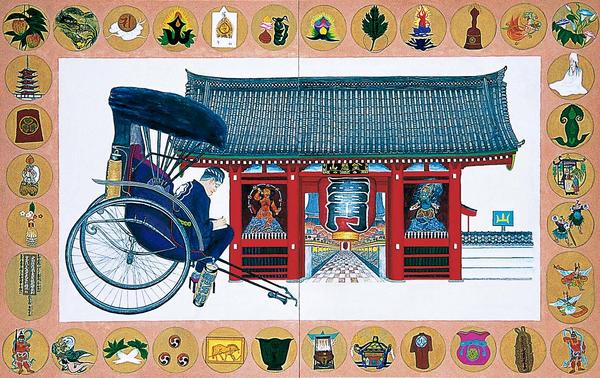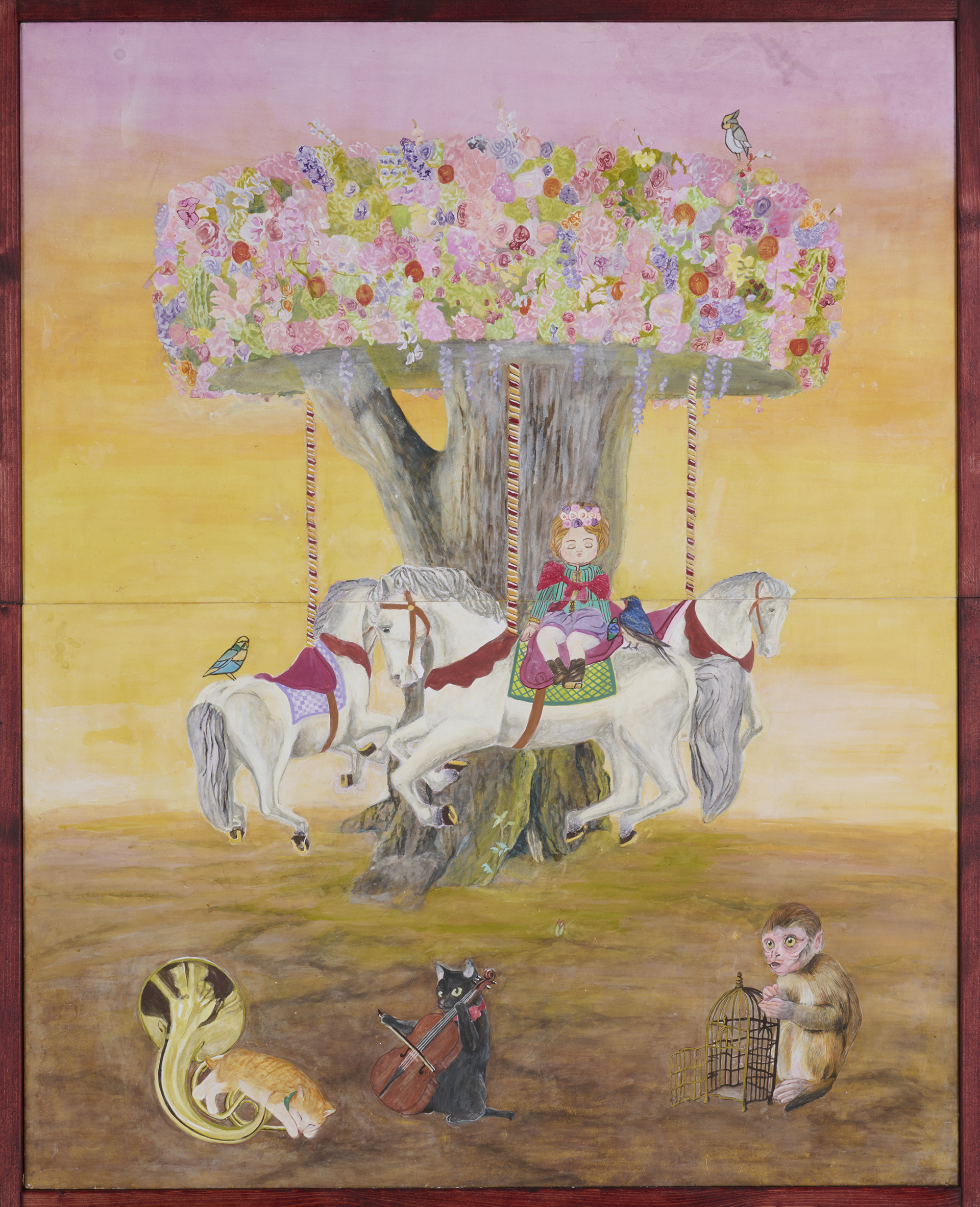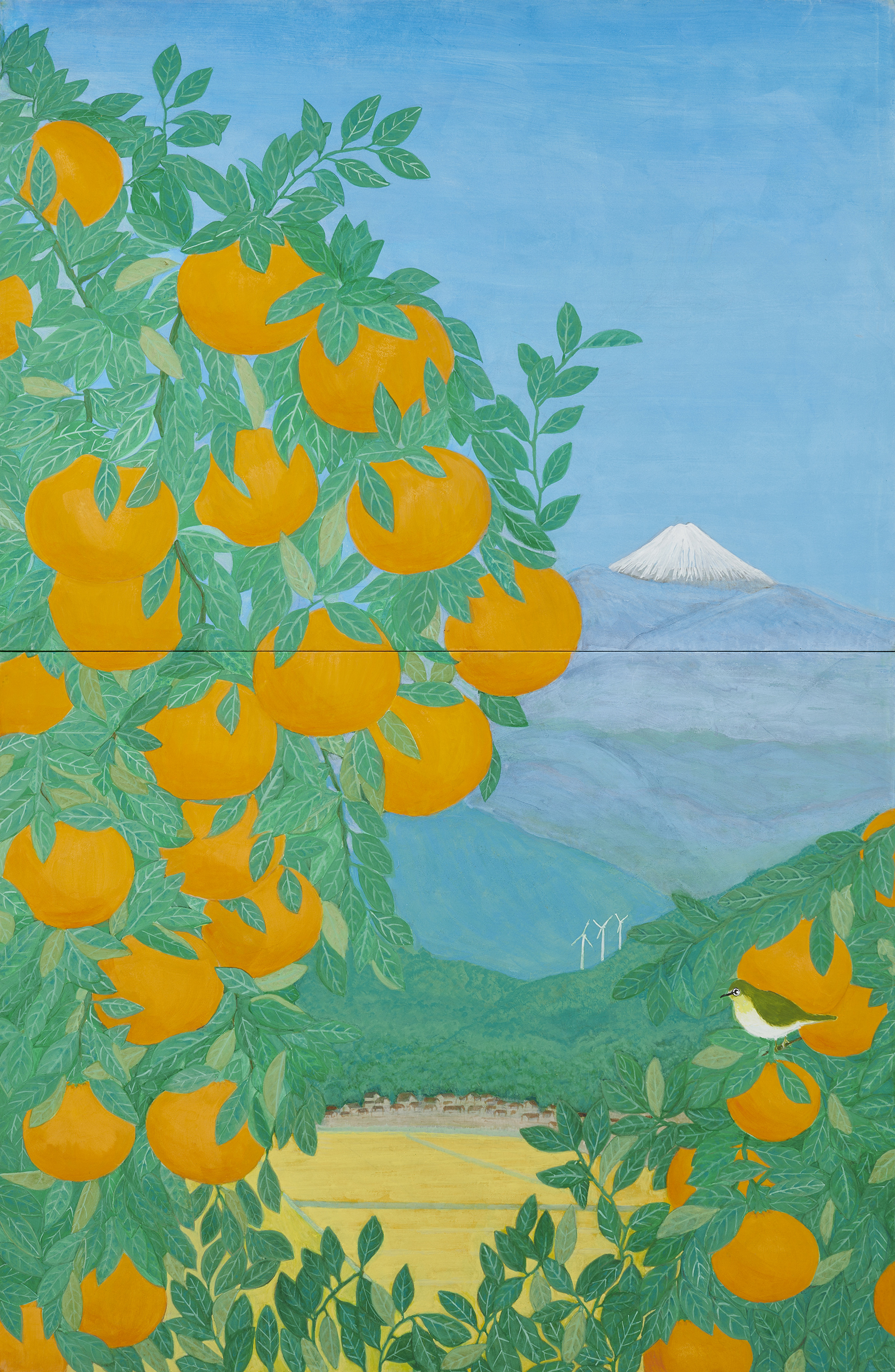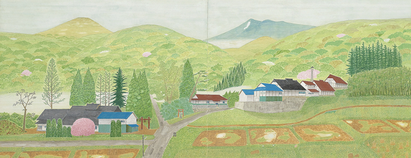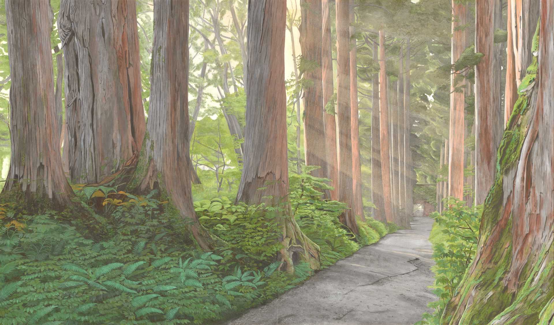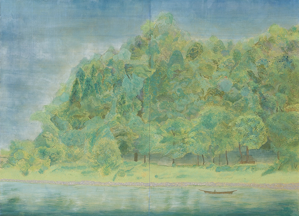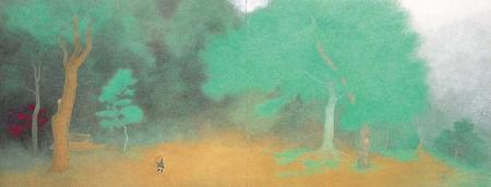 162.1×112.1cm 紙本、岩絵具・水干絵具 季節は初夏、太陽の光を一身に受け止める樹は地味な色で自然の洗礼により木肌はひび割れ、ごつごつと鎧をまとっている。しかし希望が宿っている。それは木の枝葉を剪定された切株から新しい芽を次々に伸ばして大地の根からも脇芽が次々に伸びているからだ。その若葉は光り輝き、大地と樹木の生命の薫香に希望を感じ自然の神々しさに敬服する。