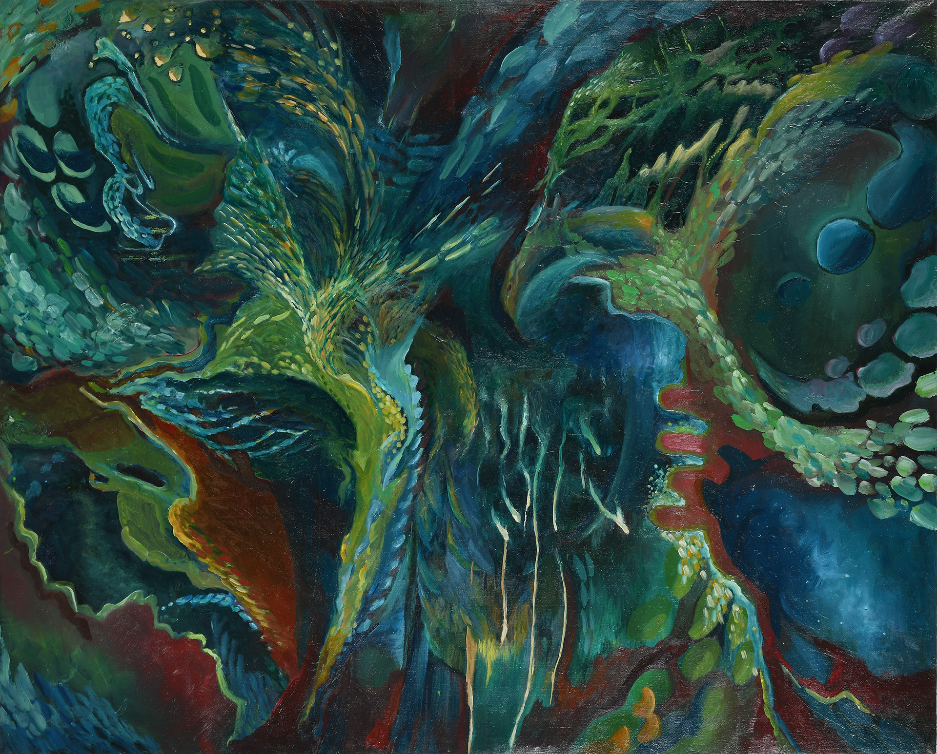 162.0×130.3cm キャンバス、油彩 一面に広がる蓮田の四季は美しい。柔らかな萌葱色の春、力強い濃青の夏、黄昏れた茜色の秋、沈静で褐色の冬、それぞれに味わい深い表情を醸し出す。命の輪廻を感じさせるその風景が、五感を通して心にどう映り、どう語りかけてきたのか、造形も色彩も感じたままを素直に表現してみた。蓮達との対話を楽しみながら。