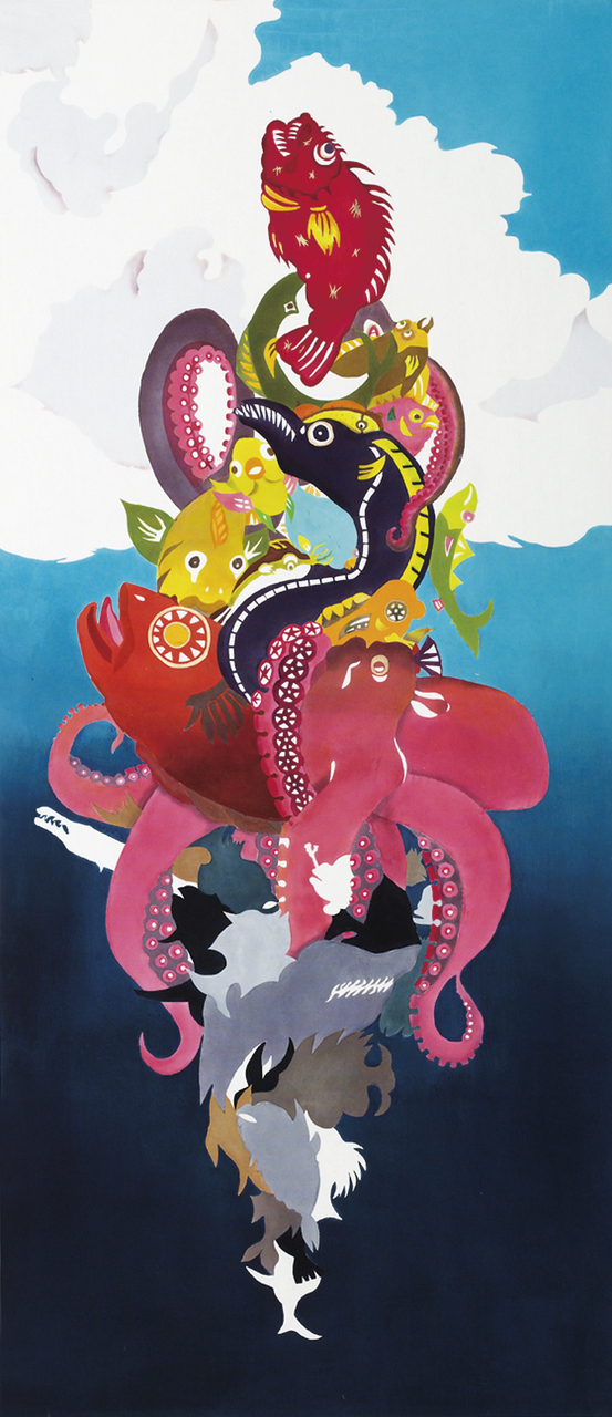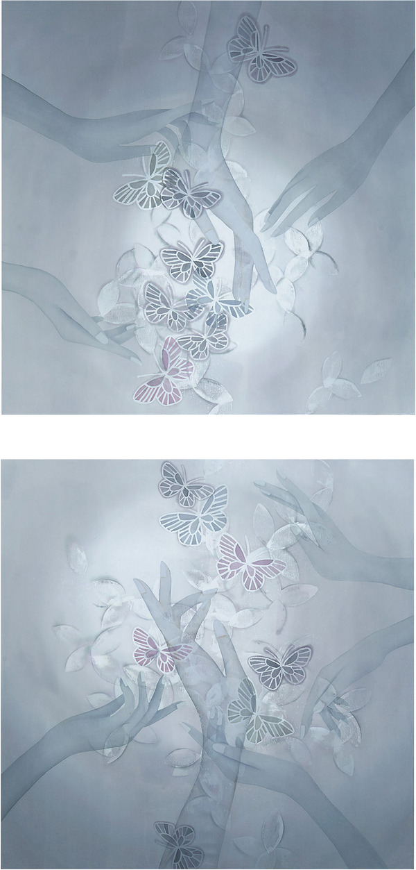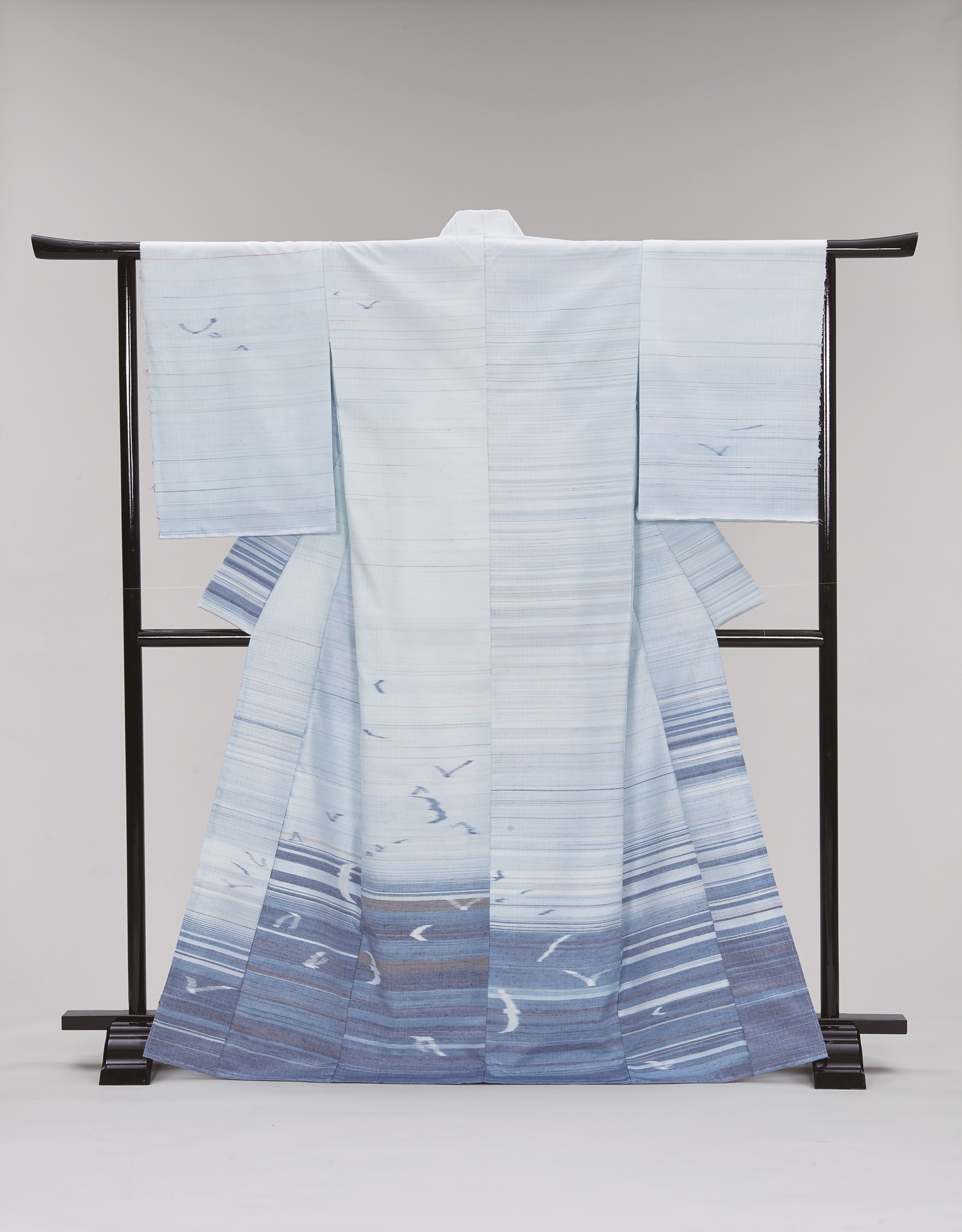 着物 絹、天然染料、平織・絣・浮織 冬の朝、落ち葉も草も霜が降りて縁飾りのように白く結晶がついた。柔らかい土は盛り上がり霜柱が立った。針のような霜柱の姿や、霜柱の土の中でのきらめき、降りかかったすべての物についた氷の粒、キンと冷えた早朝の景色をきものにした。