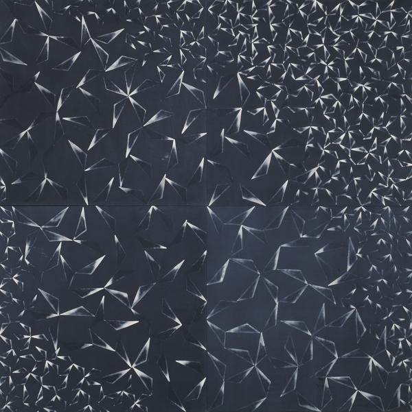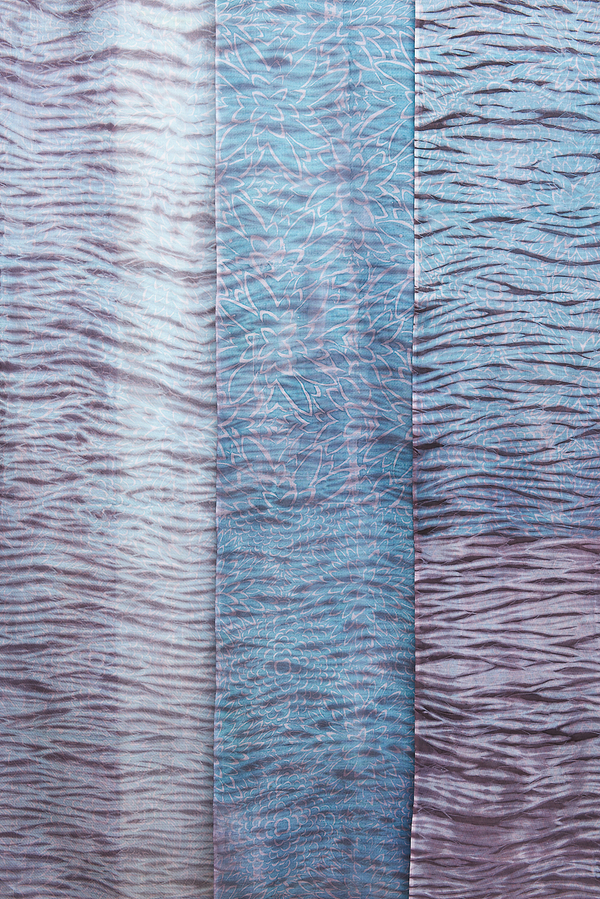 着物 絹、天然染料、平織・絣 着物に絵を描きたい、絣で形を表したい。和の具象、白と赤で表現出来るものは何か…金魚をモチーフに決め、背景のデザインを進める内に、着た時に大好きな水の中にいるような作品にしたいとイメージがかたまった。水草とともに自然の揺らぎを感じられるように。