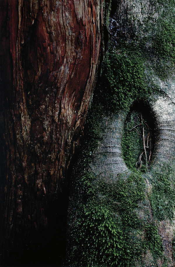 デジタル インクジェットプリント 森の中でシンパセティック(交感的・共感的)な姿勢で場に没入し、無意識やインプロビゼーションを使った撮影に取り組みました。すると木々からの眼差しを感じるようになり、その不思議な形に私自身の内面が揺り動かされ、それらに喚起されたイメージが、写真に投射されていると思うようになったのです。そうした経緯から生まれた作品です。