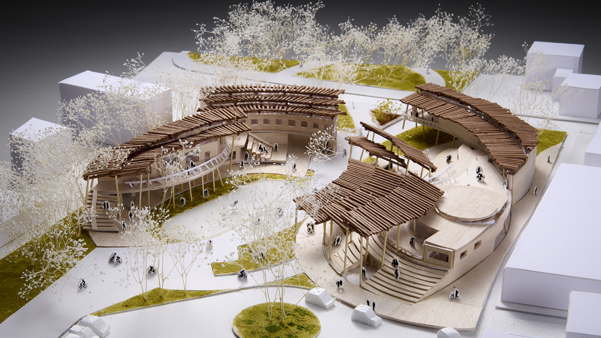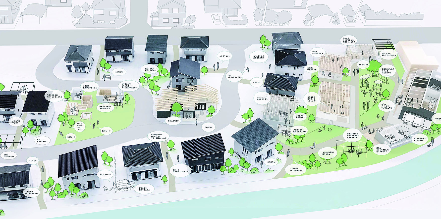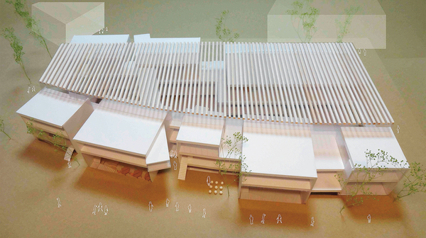 北に山、南に谷と森、川のある豊かな自然に囲まれた敷地は、大阪都心からもほど近い阪急池田駅の徒歩圏内に位置する。豊かな環境の中で、母と子の関わりに主な焦点を当て、地域に見守られながら子育てが可能な場を提案する。山から谷に向かって緩やかに地形を再現した屋根は、光を取り込みながら内と外を、自然と人を、人と人とを繋げていく。