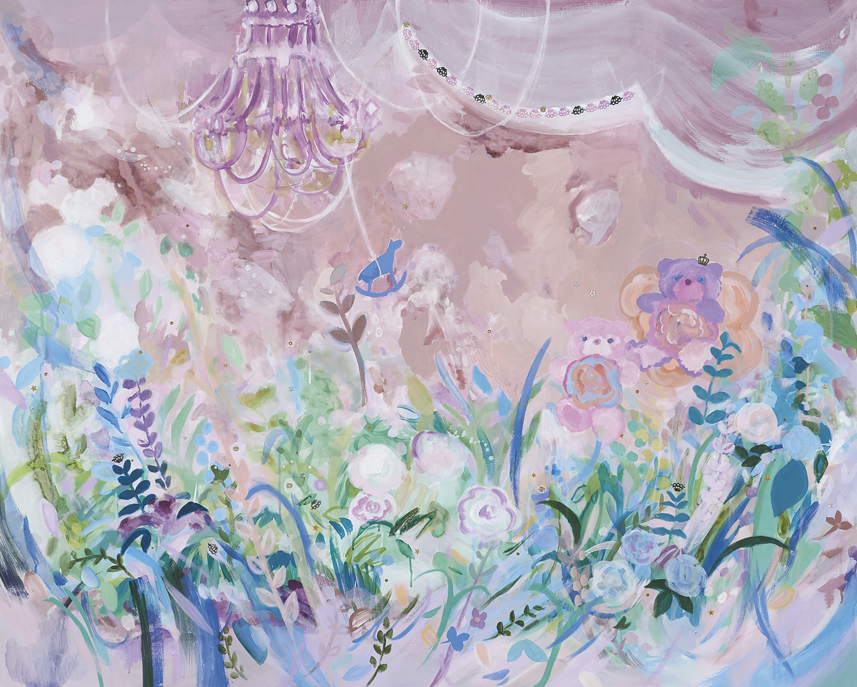 テーマは自然・空間(空気)です。感情表現や主張を意図しないで偶然に出来る線や形を利用しながら刷毛や布や指で塗ったりサンドペーパーで削ったりを繰り返して好きな色や形が出てくるまで遊びたいと思っている。気に入った画面が出来たらあとは見る人に預けたい。人によって違ういろんな風景を思い浮かべてもらえたらいいな。