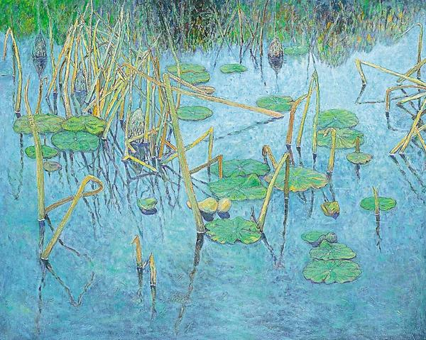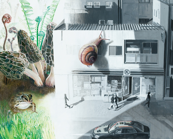 ゴーギャンがタヒチで出会ったような南方の風土が発する強烈なエネルギーを表現したいと思い、名古屋市の東山動植物園へ取材に行き温室内で巨大なヘリコニア・ロストラータに出会った。大きく広がる葉の表裏は鮮やかな緑のコントラストが美しく、さらに赤い花を付けて情熱的なこの植物は、生命力にあふれてとても魅了された。