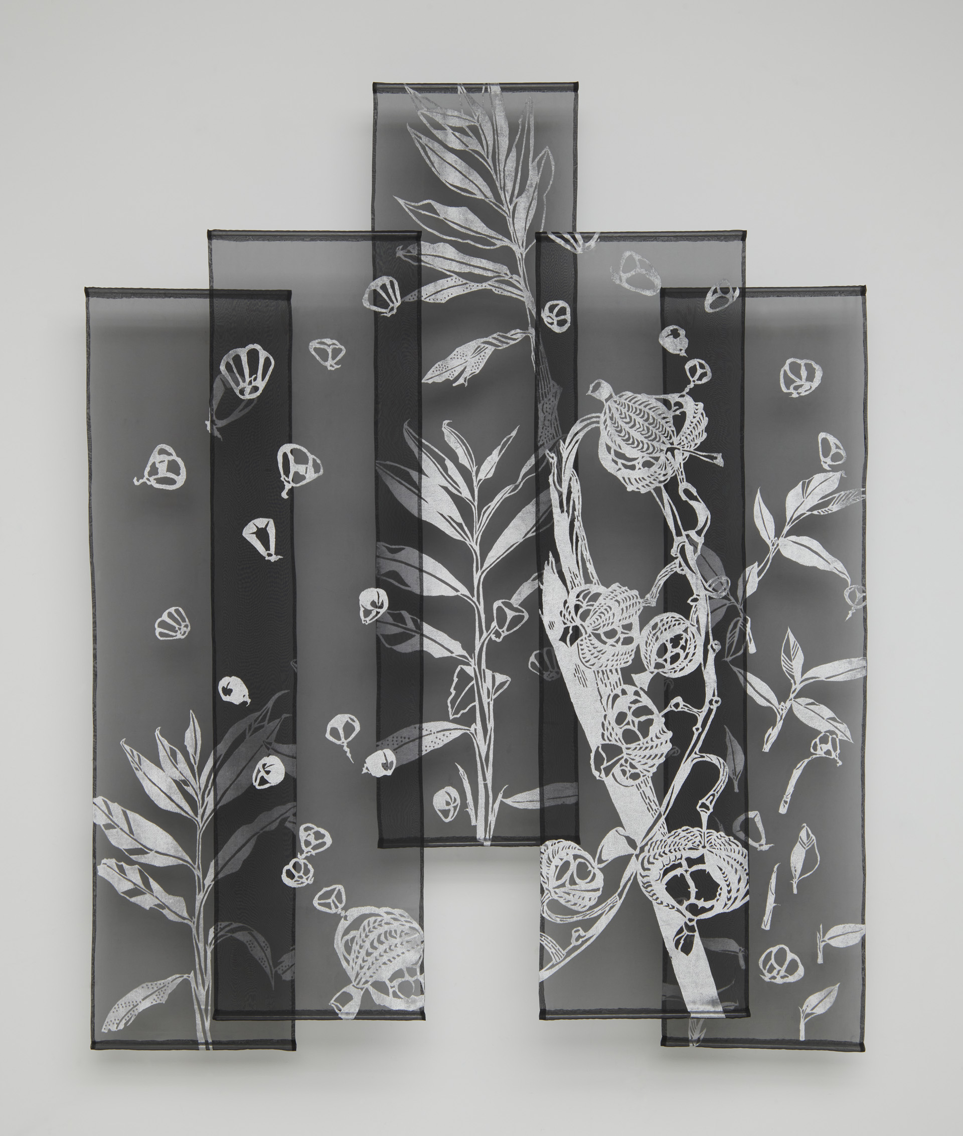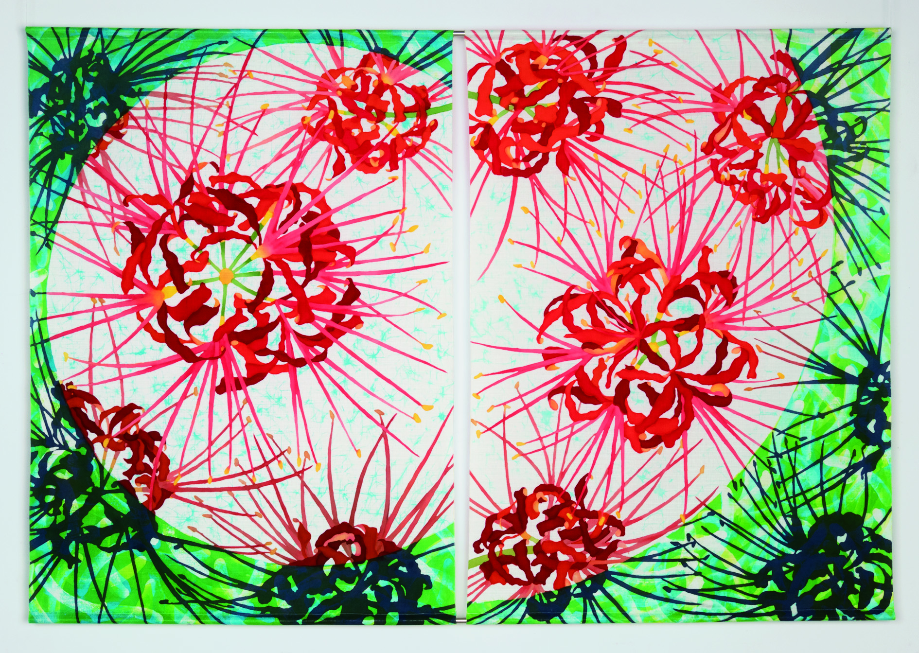 アラスカ・ホーマーに息子夫婦が永住して25年たつ。二人の子どもを育ててくれた土地と友人たち。訪問するたび「宇宙の偉大さ」に感動する。感謝をこめて綴れ織りでホーマーの風景を製作した。二枚の法被はその地に生きる人々への応援歌だ。裂織は日本の着物を裂いたもの。裂織りを通じて私の世界観を表現したいと決意した作品である。