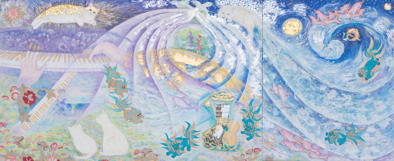 音の波に乗って若獅子やイルカや花が楽しく遊んでいます。